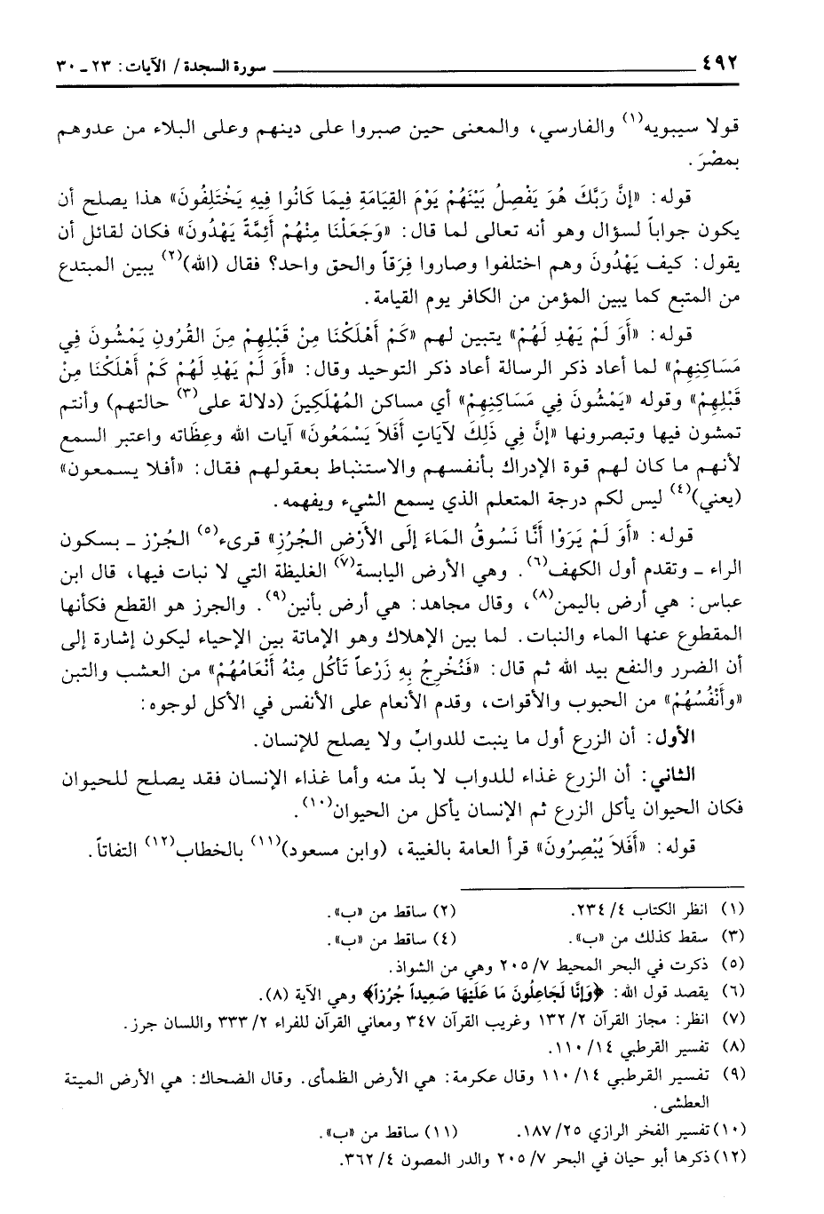 قوله: {أَوَلَمْ يَرَوْاْ أَنَّا نَسُوقُ المآء إِلَى الأرض الجرز} قرىء الجُرْز - بسكون الراء - وتقدم أول الكهف. وهي الأرض اليابسة الغليظة التي لا نبات فيها، قال ابن عباس: هي أرض باليمن، وقال مجاهد: هي أرض بأنين. والجرز هو القطع فكأنها المقطوع عنها الماء والنبات. لما بين الإهلاك وهو الإماتة بين الإحياء ليكون إشارة إلى أن الضرر والنفع بيد الله ثم قال: {فَنُخْرِجُ بِهِ زَرْعاً تَأْكُلُ مِنْهُ أَنْعَامُهُمْ} من العشب والتبن «وأَنْفُسُهُمْ» من الحبوب والأقوات، وقدم الأنعام على الأنفس في الأكل لوجوه: