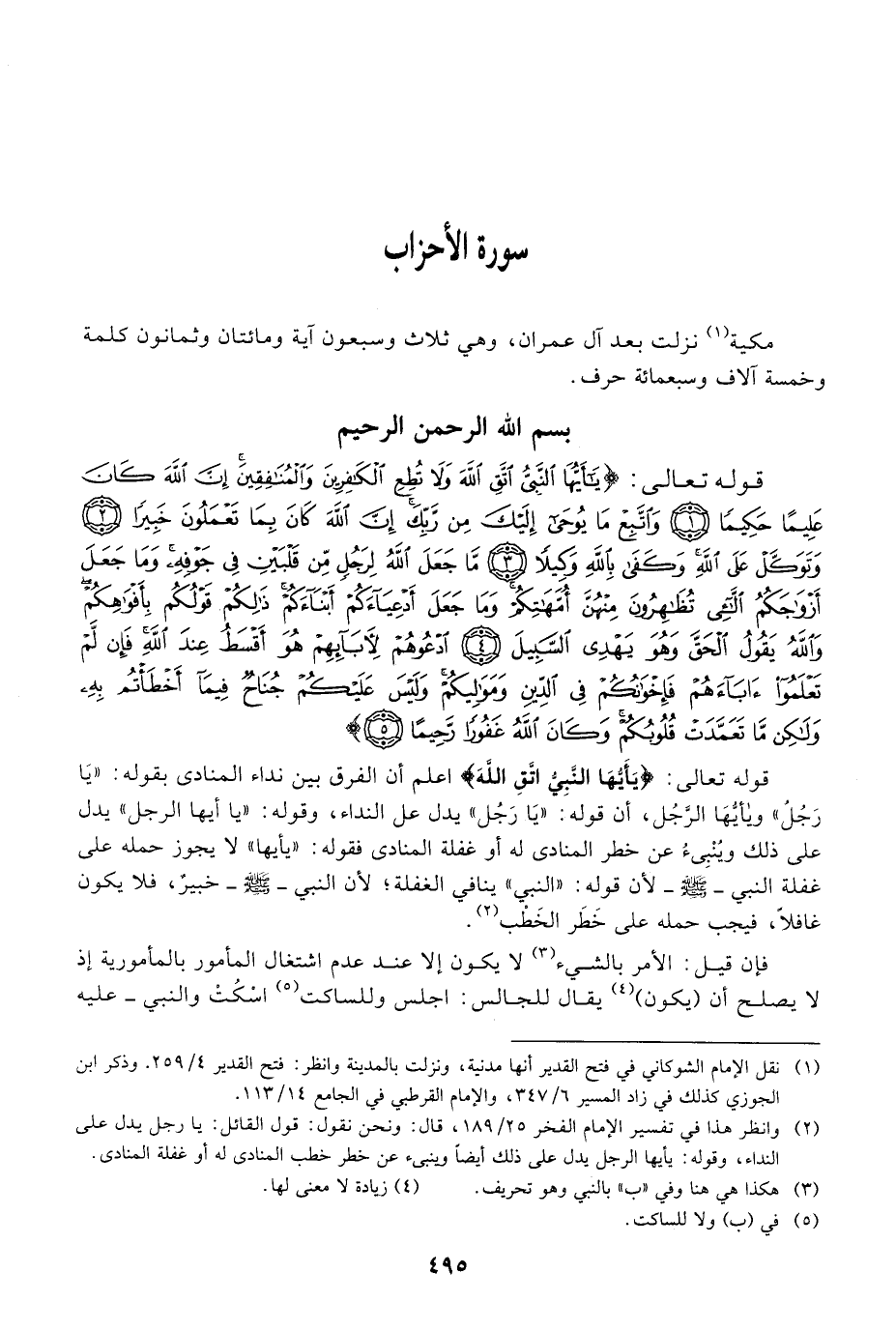 مكية نزلت بعد آل عمران، وهي ثلاث وسبعون آية ومائتان وثمانون كلمة وخمسة آلاف وسبعمائة حرف. بسم الله الرحمن الرحيم قوله تعالى: {يا أَيُّهَا النبي اتق الله} اعلم أن الفرق ين نداء المنادى بقوله: «يَا رَجُلُ» ويايُّهَا الرَّجُل، أن قوله: «يَا رَجُل» يدل على النداء، وقوله: «يا أيها الرجل» يدل على ذلك ويُنْبِىءُ عن خطر المادى له أو غفلة المنادى فقوله: «يأيها» لا يجوز حمله على غفلة النبي - صَلَّى اللَّهُ عَلَيْهِ وَسَلَّم َ - لأن قوله: «النبي» ينافي الغفلة؛ لأن النبي - صَلَّى اللَّهُ عَلَيْهِ وَسَلَّم َ - خبيرٌ، فلا يكون غافلاً، فيجب حمله على خَطَر الخَطْب.