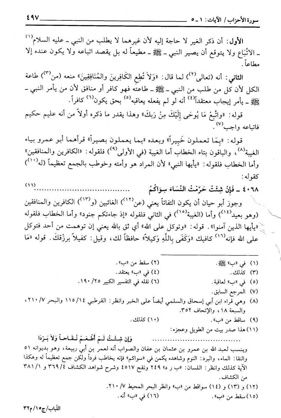 قوله: {بِمَا تَعْمَلُونَ خَبِيراً} وبعده {بِمَا يَعْمَلُونَ بَصِيراً} قرأهما أبو عمرو بياء الغيبة، والباقون بتاء الخطاب أما الغيبة (في الأولى) فلقوله «الكافرين والمنافقين» وأما الخطاب فلقوله: «يأيها النبي» لأن المراد هو وأمته وخوطب بالجمع تعظيماً (له) كقوله: