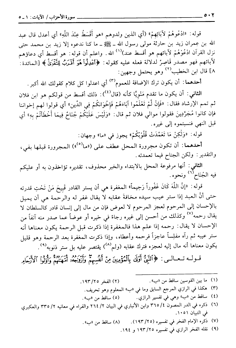 قوله: {ادعوهم لآبَآئِهِمْ} (أي الذين ولدوهم {هُوَ أَقْسَطُ عِندَ الله} أي أعدل قال عبد الله بن عِمران زيد بن حارثة مولى رسول الله - صَلَّى اللَّهُ عَلَيْهِ وَسَلَّم َ - ما كنا ندعوه إلا زيد بن محمد حتى نزل القرآن ادْعُوْهُمْ لآبائهم هو أقسط عند) الله. واعلم أن قوله: هو أقسط أي دعاؤهم لآبائهم فهو مصدر قَاصِرٌ لدلالة فعله عليه كقوله: {اعدلوا هُوَ أَقْرَبُ للتقوى} [المائدة: 8] قال ابن الخطيب وهو يحتمل وجهين: