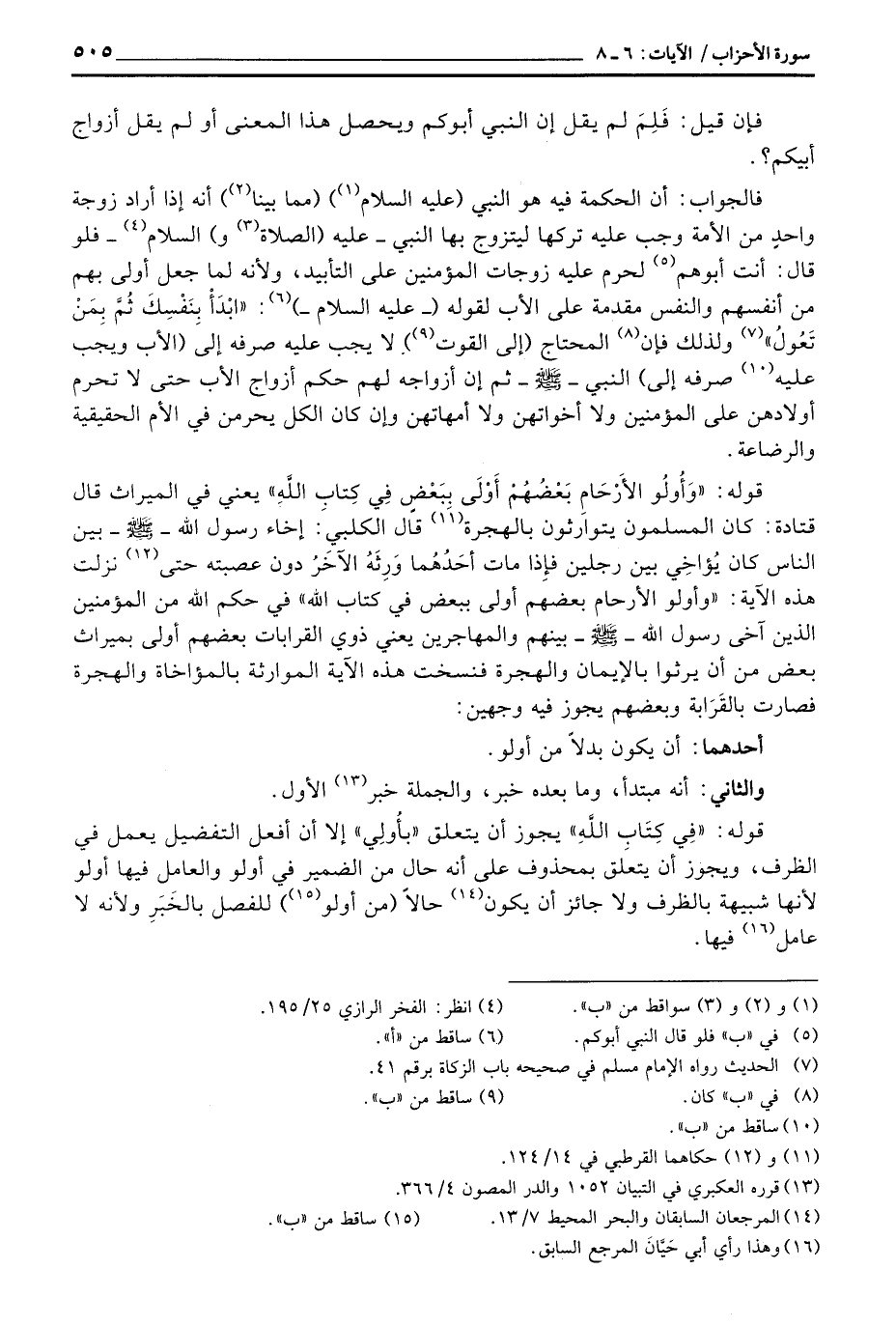 قوله: {وَأُوْلُو الأرحام بَعْضُهُمْ أولى بِبَعْضٍ فِي كِتَابِ الله} يعني في الميراث قال قتادة: كان المسلمون يتوارثون بالهجرة قال الكلبي: إخاء رسول الله - صَلَّى اللَّهُ عَلَيْهِ وَسَلَّم َ - بين الناس كان يُؤاخِي بين رجلين فإِذا مات أحَدُهُما وَرِثَهُ الأخَرُ دون عصبته حتى نزلت هذه الآية: {وأولو الأرحام بعضهم أولى ببعض في كتاب الله} في حكم الله من المؤمنين الذين آخى رسول الله - صَلَّى اللَّهُ عَلَيْهِ وَسَلَّم َ - بينهم والمهاجرين يعني ذوي القرابات بعضهم أولى بميراث بعض من أن يرثوا بالإيمان والهجرة فنسخت هذه الآية الموارثة بالمؤاخاة والهجرة فصارت بالقَرَابة وبعضهم يجوز فيه وجهين: