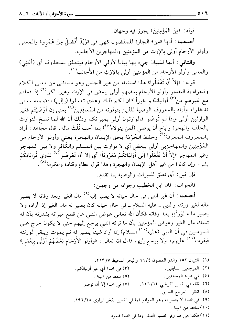 قوله: {إِلاَّ أَن تفعلوا} هذا استثناء من غير الجنس وهو مستثنى من معنى الكلام وفحواه إذا التقدير وأولو الأرحام بعضهم أولى ببعض في الإرث وغيره لكن إذا فعلتم مع غيرهم من أوليائكم خيراً كان لكم ذلك وعدى تفعلوا (بإلى) لتضمنه معنى تدخلوا، وأراد بالمعروف الوصية للذين تولونه من المُعاقِدِينَ يعني إن أوْصَيْتُم فغير الوارثين أولى وإذا لم تُوصُوا فالوارثون أولى بميراثكم وذلك أن الله لما نسخ التوارث بالحلف والهجرة وأباح أن يوصي (لمن يتولاه) بما أحب ثُلُثَ ماله. قال مجاهد: أراد بالمعروف المعرفة وحفظ الحُرْمَة بحق الإيمان والهجرة يعني وأولو الأرحام من المُؤِمِنِينَ والمهاجرين أولى ببعض أي لا توارث بين المسلم والكَافِرِ ولا بين المهاجر وغير المهاجر {إِلاَّ أَن تفعلوا إلى أَوْلِيَآئِكُمْ مَّعْرُوفاً} أي إلا أن تَعْرِضُوا لذوي قُرَابَاتِكُمْ بشيء وإن كانوا من غير أهل الإيمان والهجرة وهذا قول عطاءٍ وقتادةَ وعكرمة.