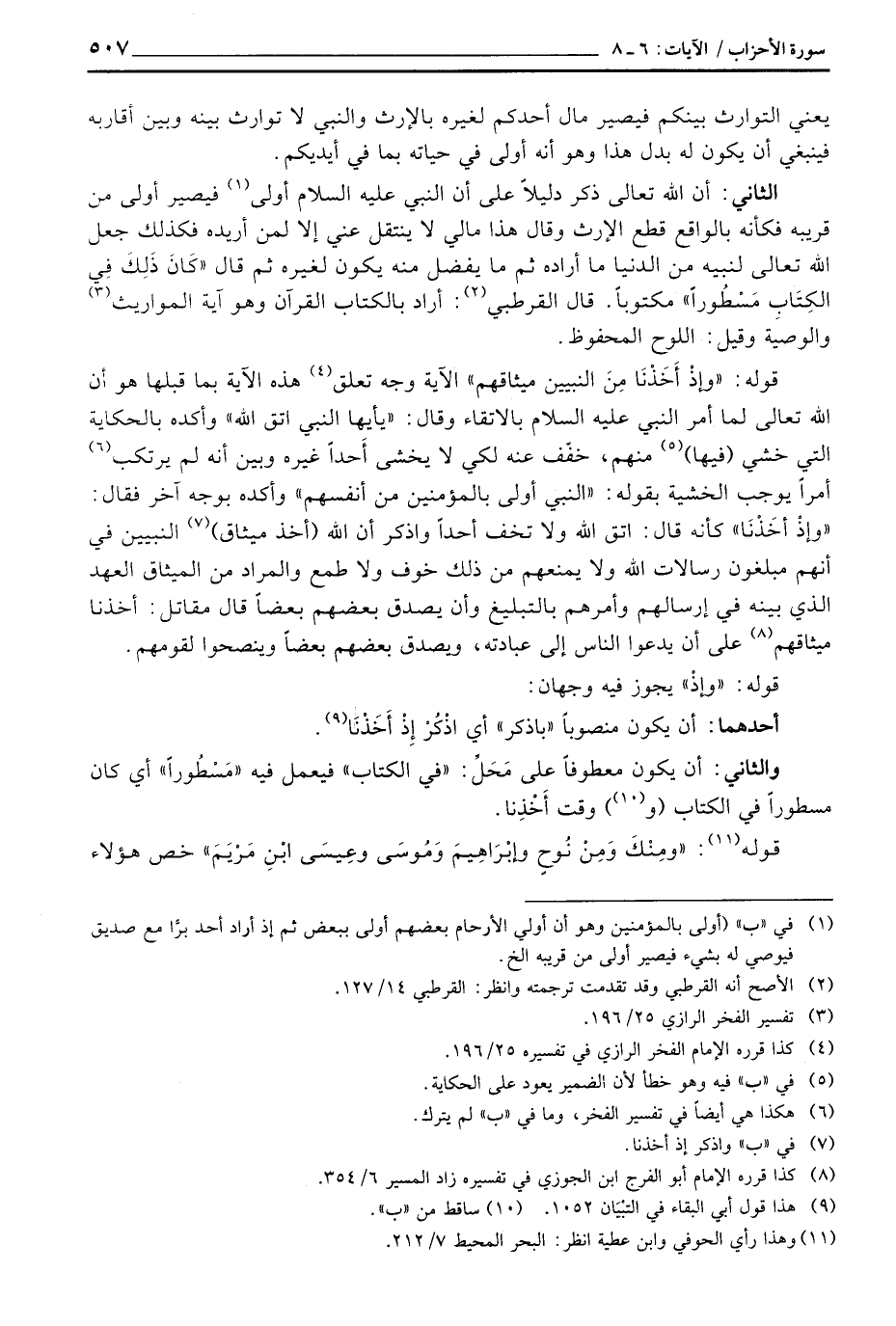 الثاني: أن الله تعالى ذكر دليلاً على أن النبي عليه السلام أولى فيصير أولى من قريبه فكأنه بالواقع قطع الإرث وقال هذا مالي لا ينتقل عني إلا لمن أريده فكذلك جعل الله تعالى لنبيه من الدنيا ما أراده ثم ما يفضل منه يكون لغيره ثم قال: {كَانَ ذَلِكَ فِي الكتاب مَسْطُوراً} مكتوباً.