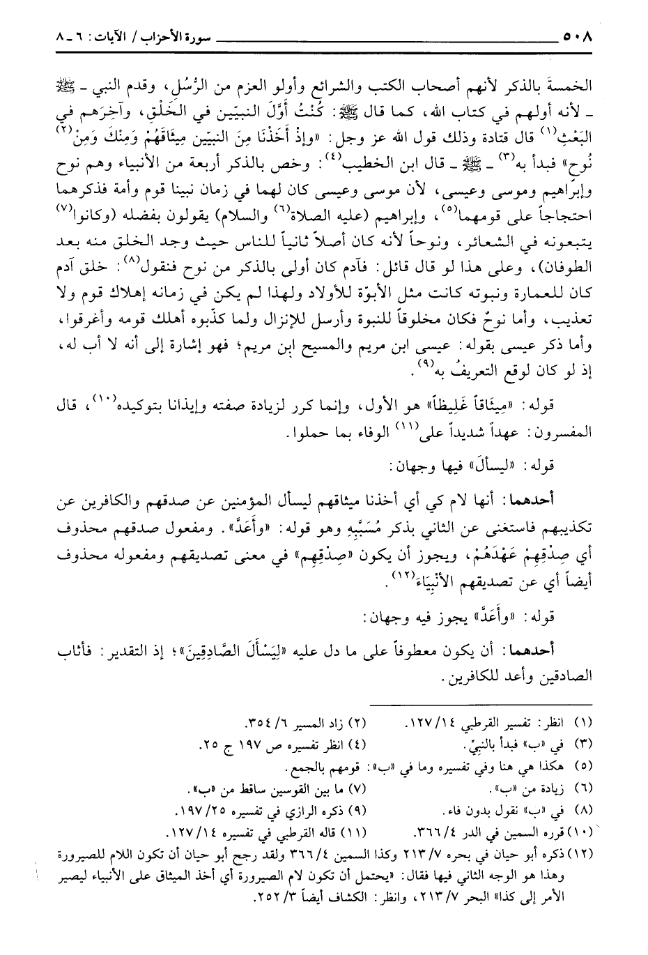 قوله:» مِيثَاقاً غَلِيظاً «هو الأول، وإنما كرر لزيادة صفته وإيذانا بتوكيده، قال المفسرون: عهداً شديداً على الوفاء بما حملوا. قوله:» ليسألَ «فيها وجهان: