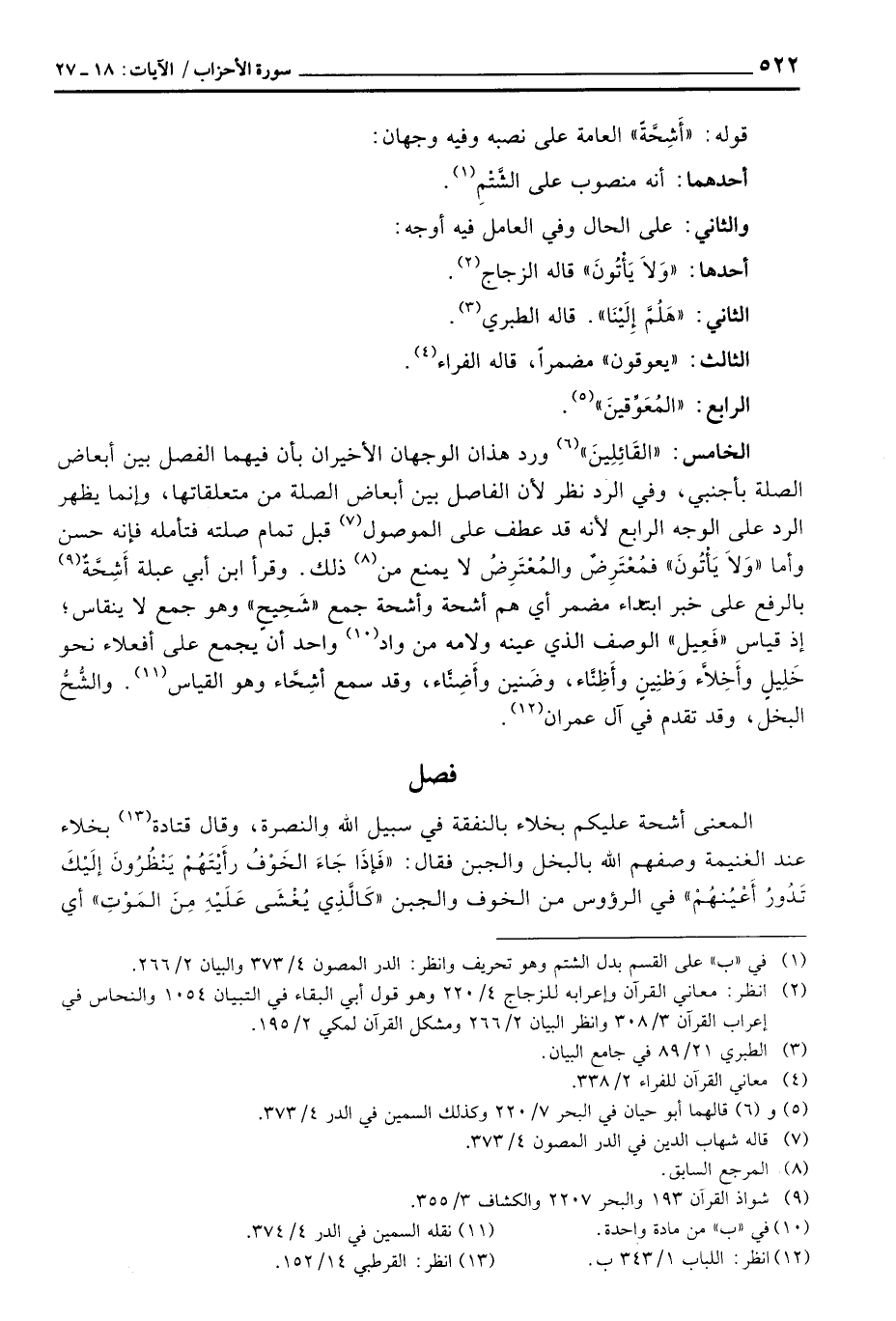 الخامس: «القَائِلِينَ» ورد هذان الوجهان الأخيران بأن فيهما الفصل بين أبعاض الصلة بأجنبي، وفي الرد نظر لأن الفصل بين أبعاض الصلة من متعلقاتها، وإنما يظهر الرد على الوجه الرابع لأنه قد عطف على الموصول قبل تمام صلته فتأمله فإنه حسن وأما «وَلاَ يَأْتُونَ» فمُعْتَرِضٌ والمُعْتَرِضُ لا يمنع من ذلك. وقرأ ابن أبي عبلة أَشِحَّةٌ بالرفع على خبر ابتداء مضمر أي هم أشحة وأشحة جمع «شَحِيحٍ» وهو جمع لا ينقاس؛ إذ قياس «فَعِيل» الوصف الذي عينه ولامه من واد واحد أن يجمع على أفعلاء نحو خَلِيلٍ وأَخِلاَّء وَظنِينٍ وأَظِنَّاء، وضَنين وأَضِنَّاء، وقد سمع أشِحَّاء وهو القياس.