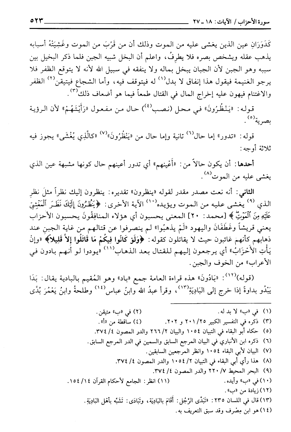 الثاني: أنه نعت مصدر مقدر لقوله «ينظرون» تقديره: ينظرون إليك نظراً مثلَ نظرِ الذي يغشى عليه من الموت ويؤيده الآية الأخرى: {يَنظُرُونَ إِلَيْكَ نَظَرَ المغشي عَلَيْهِ مِنَ الموت} [محمد: 20] المعنى يحسبون أي هؤلاء المانفِقُونَ يحسبون الأحزاب يعني قريشاً وغَطَفَانَ واليهود «لَمْ يذهبُوا» لم ينصرفوا عن قتالهم من غاية الجبنِ عند ذهابهم كأنهم غائبون حيث لا يقاتلون كقوله: {وَلَوْ كَانُواْ فِيكُمْ مَّا قاتلوا إِلاَّ قَلِيلاً} {وَإِن يَأْتِ الأحزاب} أي يرجعون إليهم للقتال بعد الذهاب {يودوا لو أَنهم بادون في الأعراب} من الخوف والجبن.
