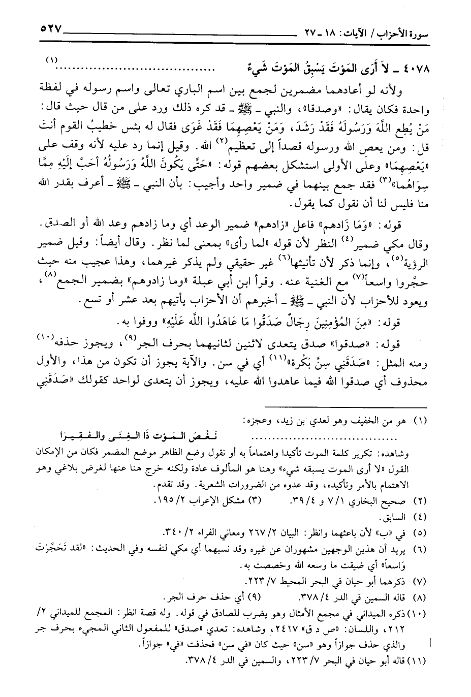 ولأنه لو أعادهما مضمرين لجمع بين اسم الباري تعالى واسم رسوله في لفظة واحدة فكان يقال: «وصدقا» ، والنبي - صَلَّى اللَّهُ عَلَيْهِ وَسَلَّم َ - قد كره ذلك ورد على من قال حيث قال: مَنْ يُطِع اللَّهَ وَرَسُولَهُ فَقَدْ رَشَدَ، وَمَنْ يَعْصِهِمَا فَقَدْ غَوَى فقال له بئس خطيبُ القوم أنتَ قل: ومن يعص الله ورسوله قصداً إلى تعظيم الله. وقيل إنما رد عليه لأنه وقف على «يَعْصِهِمَا» وعلى الأولى استشكل بعضهم قوله: «حَتَّى يَكُونَ اللَّهُ وَرَسُولُهُ أَحَبَّ إلَيْهِ مِمَّا سِوَاهُما» فقد جمع بينهما في ضمير واحد وأجيب: بأن النبي - صَلَّى اللَّهُ عَلَيْهِ وَسَلَّم َ - أعرف بقدر الله منا فليس لنا أن نقول كما يقال.