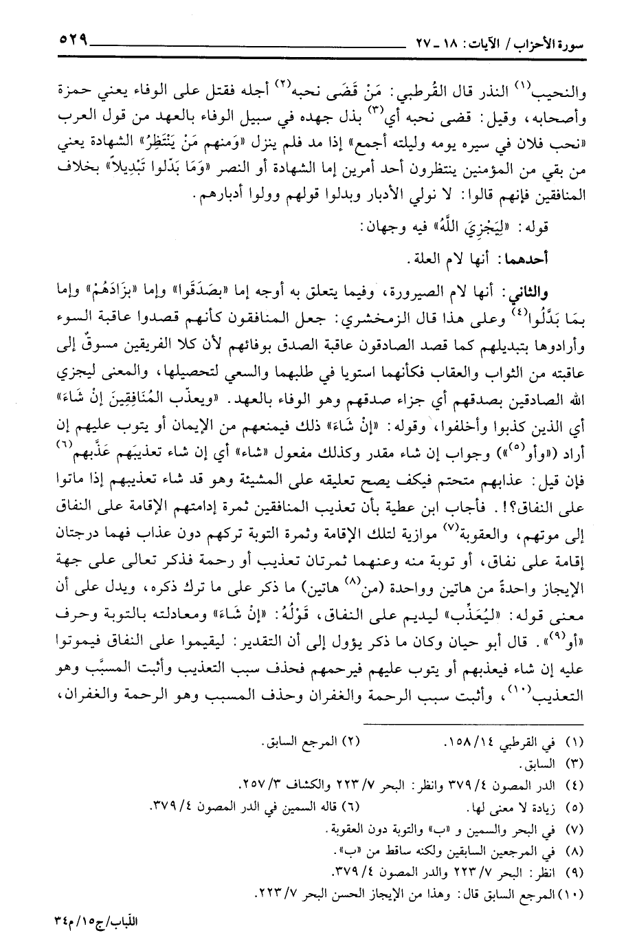 والنحيب النذر قال القُرطبي: مَنْ قَضَى نحبه أجله فقتل على الوفاء يعني حمزة وأصحابه، وقيل: قضى نحبه أي بذل جهده في سبيل الوفاء بالعهد من قول العرب «نحب فلان في سيره يومه وليلته أجمع» إذ مد فلم ينزل {وَمِنْهُمْ مَّن يَنتَظِرُ} الشهادة يعني من بقي من المؤمنين ينتظرون أحد أمرين إما الشهادة أو النصر {وَمَا بَدَّلُواْ تَبْدِيلاً} بخلاف المنافقين فإنهم قالوا: لا نولي الأدبار وبدلوا قولهم وولوا أدبارهم.