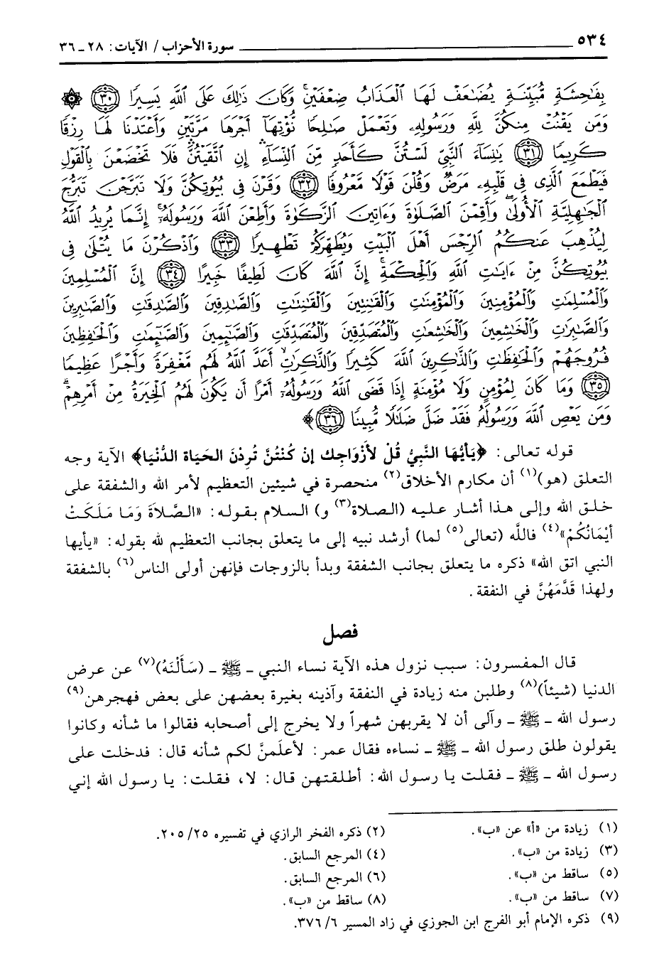 قوله تعالى: {يا أيها النبي قُل لأَزْوَاجِكَ إِن كُنتُنَّ تُرِدْنَ الحياة الدنيا} الآية وجه التعلق (هو) أن مكارم الأخلاق منحصرة في شيئين التعظيم لأمر الله والشفقة على خلق الله وإلى هذا أشار عليه (الصلاة و) السلام بقوله: «الصَّلاَةَ وَمَا مَلَكَتْ أيْمَانُكُمْ» ، فاللَّه (تعالى لما) أرشد نبيه إلى ما يتعلق بجانب التعظيم لله بقوله: {يأيها النبي اتق الله} [الأحزاب: 1] ذكره ما يتعلق بجانب الشفقة وبدأ بالزوجات فإنهن أولى الناس بالشفقة ولهذا قَدَّمَهُنَّ في النفقة.