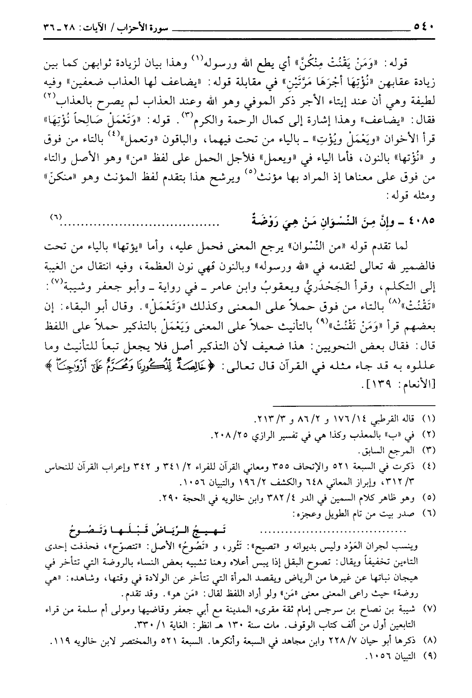 لما تقدم قوله «من النِّسْوان» يرجع المعنى فحمل عليه، وأما «يؤتها» بالياء من تحت فالضمير لله تعالى لقتدمه في «لله ورسوله» وبالنون فهي نون العظمة، وفيه انتقال من الغيبة إلى التكلم، وقرأ الجَحْدَريُّ ويعقوبُ وابن عامر - في رواية - وأبو جعفر وشيبة: «تَقْنُتْ» بالتاء من فوق حملاً على المعنى وكذلك «وَتَعْمَلْ» . وقال ابو البقاء: إن بعضهم قرأ «وَمَنْ تَقْنُتُ» بالتأنيث حملاً على المعنى وَيَعْمَلْ بالتذكير حملاً على اللفظ قال: فقال بعض النحويين: هذا ضعيف لأن التذكير أصل فلا يجعل تبعاً للتأنيث وما عللوه به قد جاء مثله في القرآن قال تعالى: {خَالِصَةٌ لِّذُكُورِنَا وَمُحَرَّمٌ على أَزْوَاجِنَا} [الأنعام: 139] .