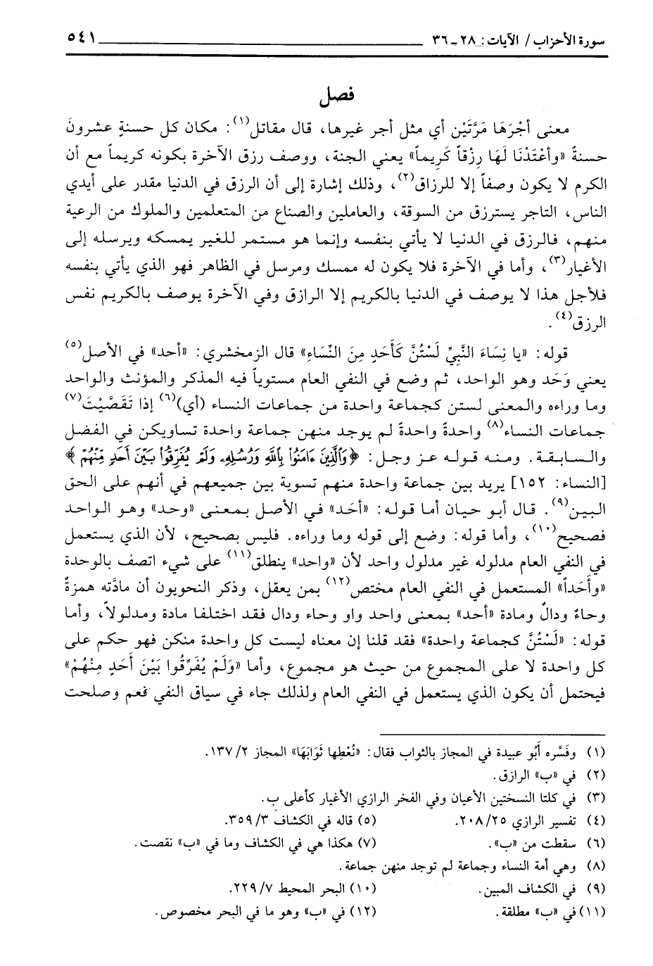 النبي لَسْتُنَّ كَأَحَدٍ مِّنَ النسآء} قال الزمخشري: «أحد» في الأصل يعني وَحَد وهو الواحد، ثم وضع في النفي العام مستوياً فيه المذكر والمؤنث، والواحد وما وراءه والمعنى لستن كجماعة واحدة من جماعة النساء (أي) إذا تَقَصَّيْتُ جماعات النساء واحدةً واحداةً لم يوجد منهن جماعة واحدة تساويكن في الفضل والسابقة. ومنه قوله عَزَّ وَجَلَّ {والذين آمَنُواْ بالله وَرُسُلِهِ وَلَمْ يُفَرِّقُواْ بَيْنَ أَحَدٍ مِّنْهُمْ} [النساء: 152] يريد بين جماعة واحدة منهم تسوية بين جميعهم في أنهم على الحق البين. قال أبو حيان أما قوله: «أحَد» في الأصل بمعنى «وحد» وهو الواحد فصحيح، وأما قوله: وضع إلى قوله وما وراءه. فليس بصحيح، لأن الذي يستعمل في النفي العام مدلوله غير مدلول واحد لأن «واحد» ينطلق على شيء اتصف بالوحدة «وأَحَداً» المستعمل في النفي العام مختص بمن يعقل، وذكر النحويون أن مادَّته همزةٌ وحاءٌ ودالٌ ومادة «أحد» بمعنى واحد واو وحاء ودال فقد اختلفا مادة ومدلولاً، وأما قوله: «لَسْتُنَّ كجماعة واحدة» فقد قلنا إن معناه ليست كل واحدة منكن فهو حكم على كل واحدة لا على المجموع من حيث هو مجموع، وأما {وَلَمْ يُفَرِّقُواْ بَيْنَ أَحَدٍ مِّنْهُمْ} فيحتمل أن يكون الذي يستعلم في النفي العام ولذلك جاء في سياق النفي فعم وصلحت