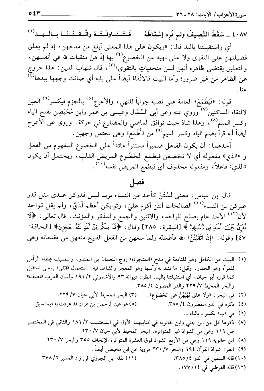 أي واستقبلتنا باليد قال: «ويكون على هذا المعنى أبلغ من مدحهن؛ إذ لم يعلق فضيلتهن على التقوى ولا على نهيه عن الخضوع بها إذْ هنّ متقيات لله في أنفسهن، والتعليق يقتضي ظاهره أنهن لسن متحليات بالتقوى، قال شهاب الدين: هذا خروج عن الظاهر من غير ضرورة وأما البيت فالاتِّقاءُ أيضاًعلى بابه أي صانت وجهها بيدها عنا.