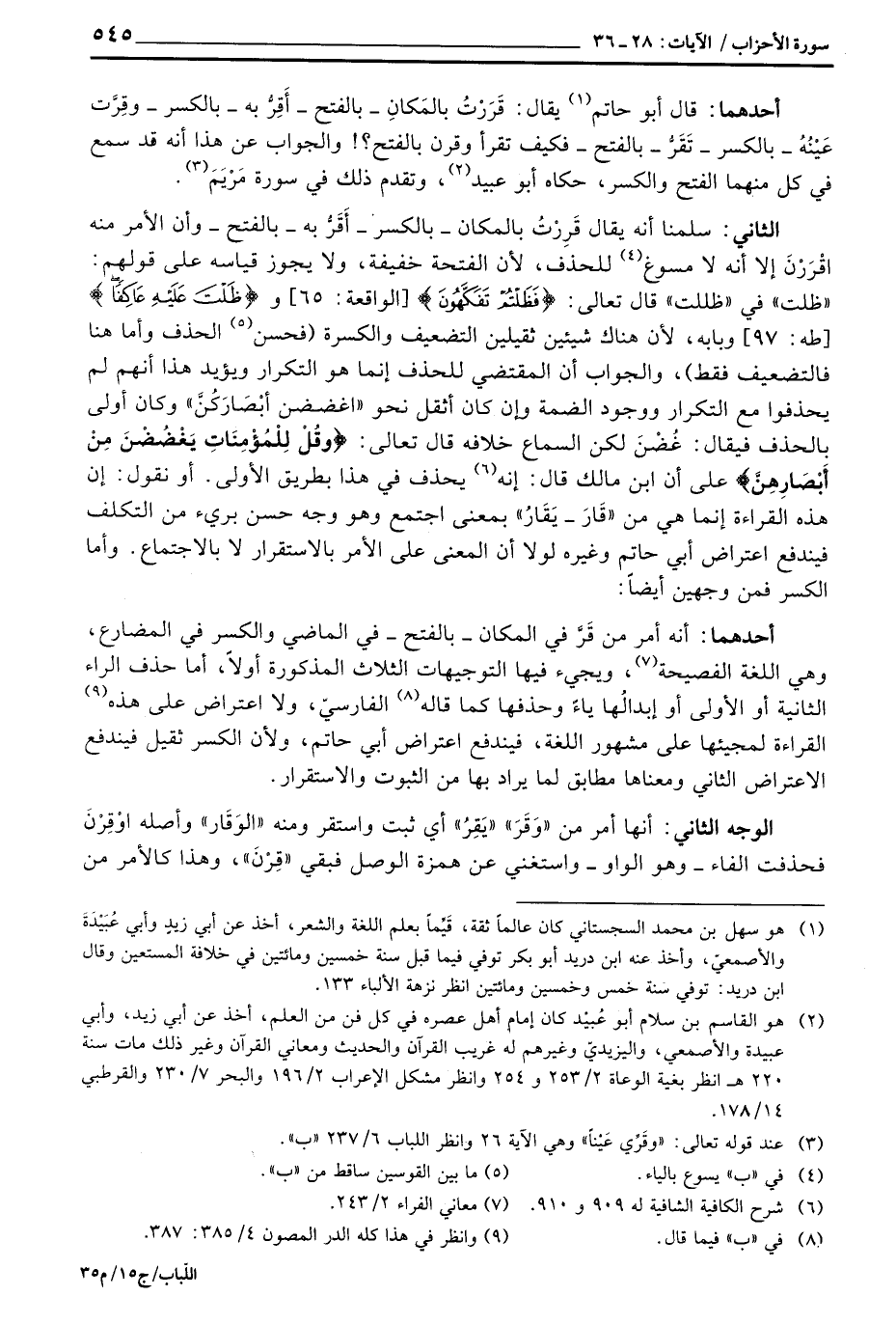 الثاني: سلمنا أنه يقال قَرِرْتُ بالمكان - بالكسر - أَقَرُّ به - بالفتح - وأن الأمر اقْرَرْنَ إلا أنه لا مسوغ للحذف، لأن الفتحة خفيفة، ولا يجوز قياسه على قولهم «ظلت» في «ظللت» قال تعالى: {فَظَلْتُمْ تَفَكَّهُونَ} [الواقعة: 65] و {ظَلْتَ عَلَيْهِ عَاكِفاً} [طه: 97] وبابه، لأن هناك شيئين ثقيلين التضعيف والكسرة (فحسن الحذف وأما هنا فالتضعيف فقط) ، والجواب أن المقتضي للحذف إنما هو التكرار ويؤيد هذا أنهم لم يحذفوا مع التكرار ووجود الضمة وإن كان أثقل نحو «اغضضن أبْصَارَكُنَّ» وكان أولى بالحذف فيقال: غَضْنَ لكن السماع خلافه قال تعالى: {وَقُل لِّلْمُؤْمِنَاتِ يَغْضُضْنَ مِنْ أَبْصَارِهِنَّ} [النور: 31] على أن ابن مالك قال: إنه يحذف في هذا بطريق الأولى. أو نقول: إن هذه القراءة إنما هي من «قَارَ - يَقَارُ» بمعنى اجتمع وهو وجه حسن بريء من التكلف فيندفع اعتراض أبي حاتم وغيره لولا أن المعنى على الأمر بالاستقرار لا بالاجتماع. وأما الكسر فمن وجهين أيضاً: