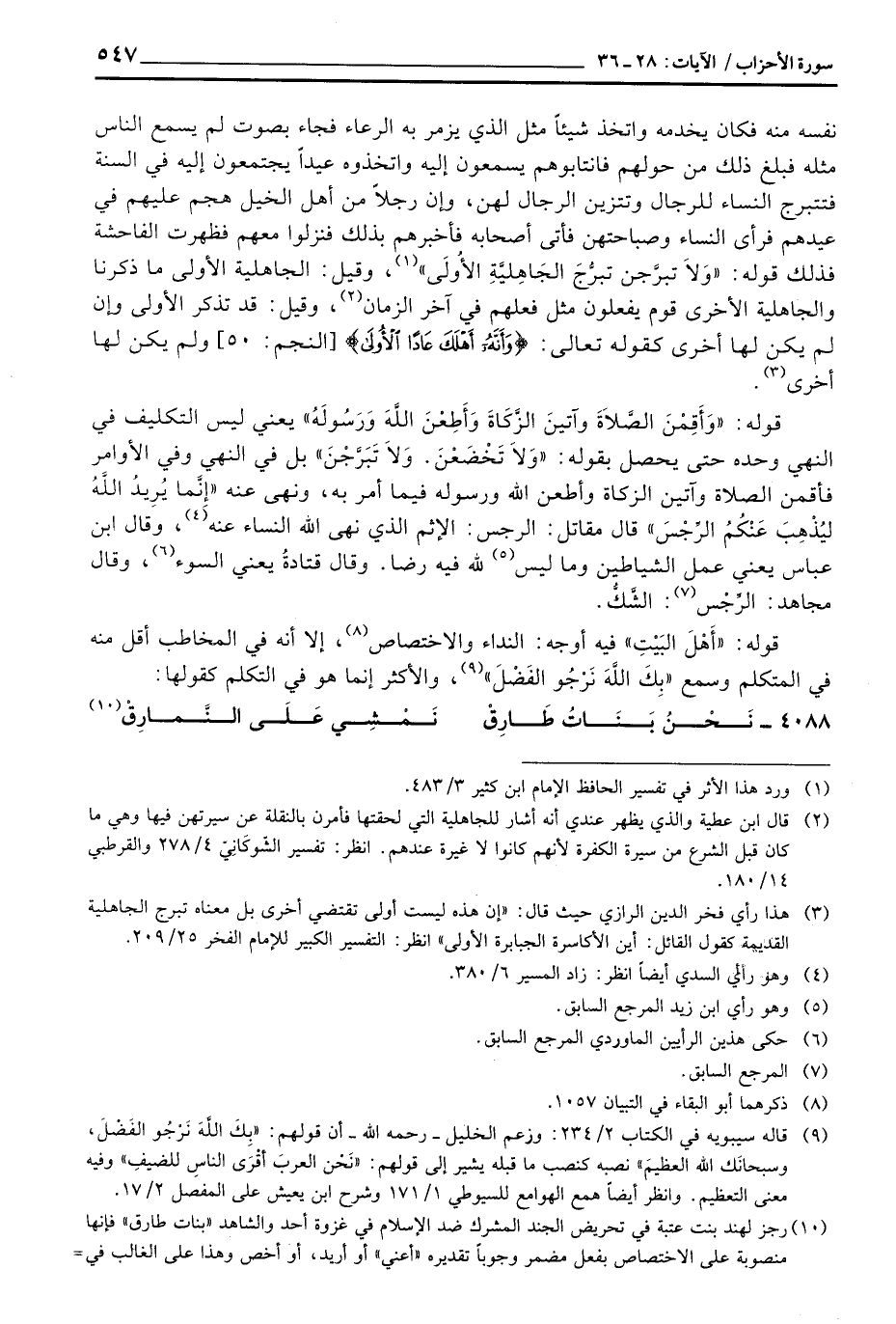 نفسه منه فكان يخدمه واتخذ شيئاً مثل الذي يزمر به الرعاء فجاء بصوت لم يسمع مثله فبلغ ذلك من حولهم فانتابوهم يسمعون إليه واتخذه عيداً يجتمعون إليه في السنة فتتبرج النساء للرجال وتتزين الرجال لهن، وإن رجلاً من أهل الخيل هجم عليهم في عيدهم فرأى النساء وصباحتهن فأتى أصحابه فأخبرهم بذلك فنزلوا معهم فظهرت الفاحشة فذلك قوله: {وَلاَ تَبَرَّجْنَ تَبَرُّجَ الجاهلية الأولى} ، وقيل: الجاهلية الأولى ما ذكرنا والجاهلية الأخرى قوم يفعلون مثل فعلهم في آخر الزمان، وقيل: قد تذكر الأولى وإن لم يكن لها أخرى كقوله تعالى: {وَأَنَّهُ أَهْلَكَ عَاداً الأولى} [النجم: 50] ولم يكن لها أخرى.