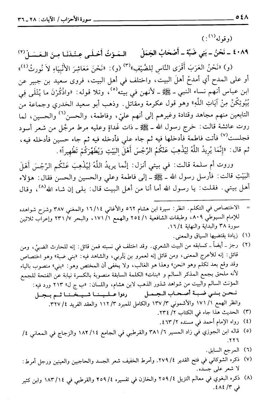 (و) «نَحْنُ العَرَبَ أَقْرَى النَّاسِ لِلضَّيْفِ» (و) : «نَحْنَ مَعَاشِرَ الأَنْبِيَاءِ لاَ نُورثُ» أو على المدح أي أمدحُ أهلَ البيت، واختلف في أهل البيت، فروى سعيد بن جبير عن ابن عباس أنهم نساء النبي - صَلَّى اللَّهُ عَلَيْهِ وَسَلَّم َ - لأنهن في بيته، وتلا قوله: {واذكرن مَا يتلى فِي بُيُوتِكُنَّ مِنْ آيَاتِ الله} وهو قول عكرمة ومقاتل. وذهب أبو سعيد الخدري وجماعة من التابعين منهم مجاهد وقتادة غيرهم إلى أنهم عليّ، وفاطمة، والحسن والحسين، لما روت عائشة قالت: «خرج رسول الله - صَلَّى اللَّهُ عَلَيْهِ وَسَلَّم َ - ذات غَداةٍ وعليه مرط مرجَّل من شعر أسود فجلست فأتت فاطمة فأدخلها فيه ثم جاء علي فأدخله فيه ثم جاء حسين فأدخله فيه، ثم قال:» إِنَّمَا يُرِيدُ اللَّهُ لِيُذْهِبَ عَنْكُمْ الرِّجْسَ أَهْلَ البَيْتَ وَيُطَهِّرَكُمْ تَطْهِيراً «