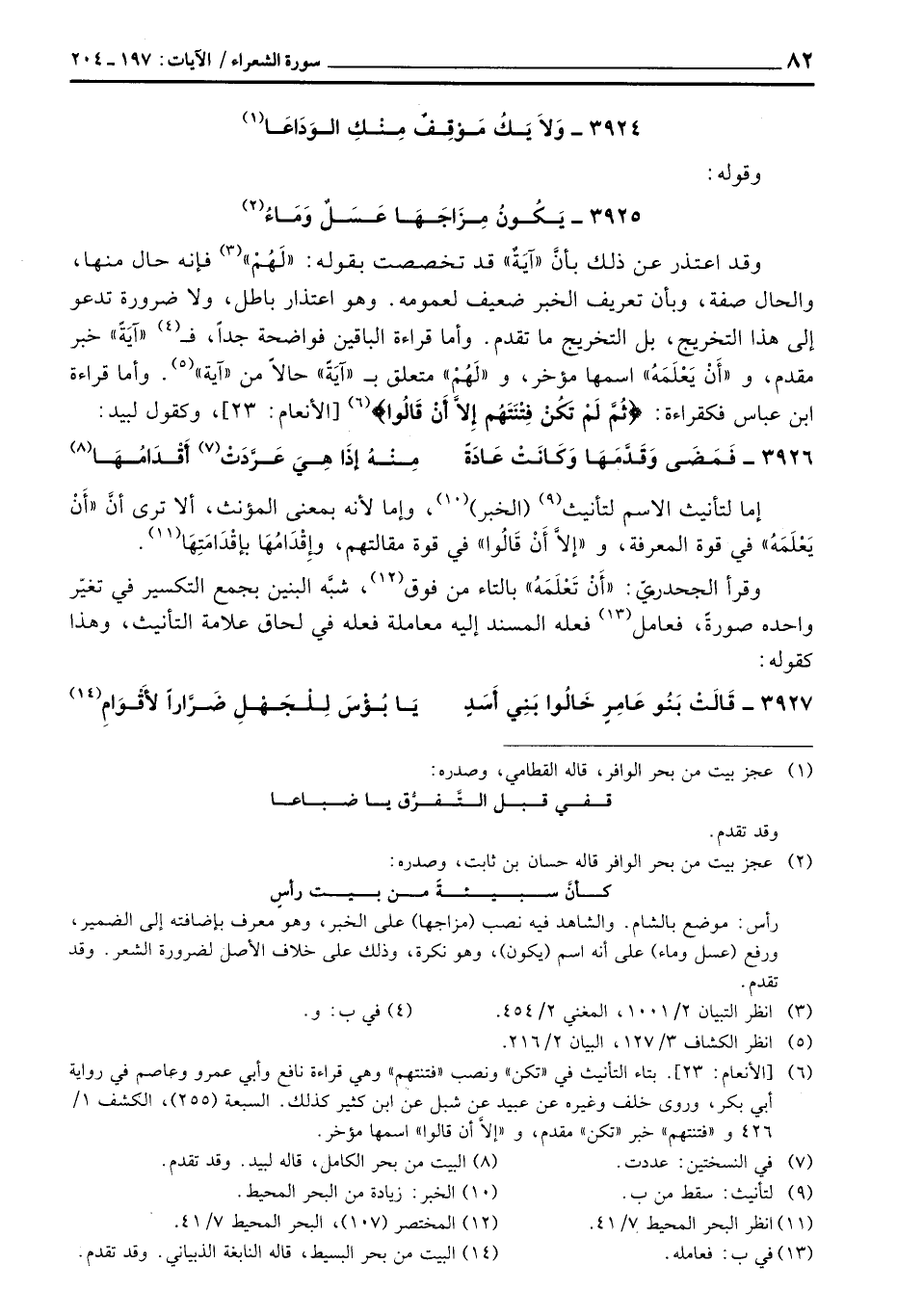 3925 - يَكُونُ مِزَاجَهَا عَسَلٌ وَمَاءٌ ... وقد اعتذر عن ذلك بأنَّ «آيَةٌ» قد تخصصت بقوله: «لَهُمْ» فإنه حال منها، والحال صفة، وبأن تعريف الخبر ضعيف لعمومه. وهو اعتذار باطل، ولا ضرورة تدعو إلى هذا التخريج، بل التخريج ما تقدم. وأما قراءة الباقين فواضحة جداً، ف «آيَةٌ» خبر مقدم، و «أَنْ يَعْلَمَهُ» اسمها مؤخر، و «لَهُمْ» متعلق ب «آيَةٌ» حالاً من «آية» . وأما قراءة ابن عباس كقراءة: {ثُمَّ لَمْ تَكُنْ فِتْنَتُهُمْ إِلاَّ أَن قَالُواْ} [الأنعام: 23] ، وكقول لبيد: