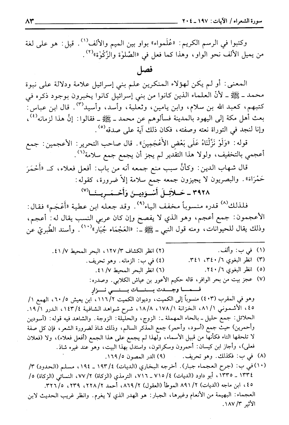 3928 - حَلاَئِلَ أَسْوَدِينَ وَأَحْمَرِينَا ... فلذلك قدره مسنوباً مخفف الياء. وقد جعله ابن عطية «أَعْجَم» فقال: الأعجمون: جمع أعجم، وهو الذي لا يفصح وإن كان عربي النسب يقال له: أعجم، وذلك يقال للحيوانات، ومنه قول النبي - صَلَّى اللَّهُ عَلَيْهِ وَسَلَّم َ -: «العَجْمَاء جُبَار» وأسند الطَّبريّ عن