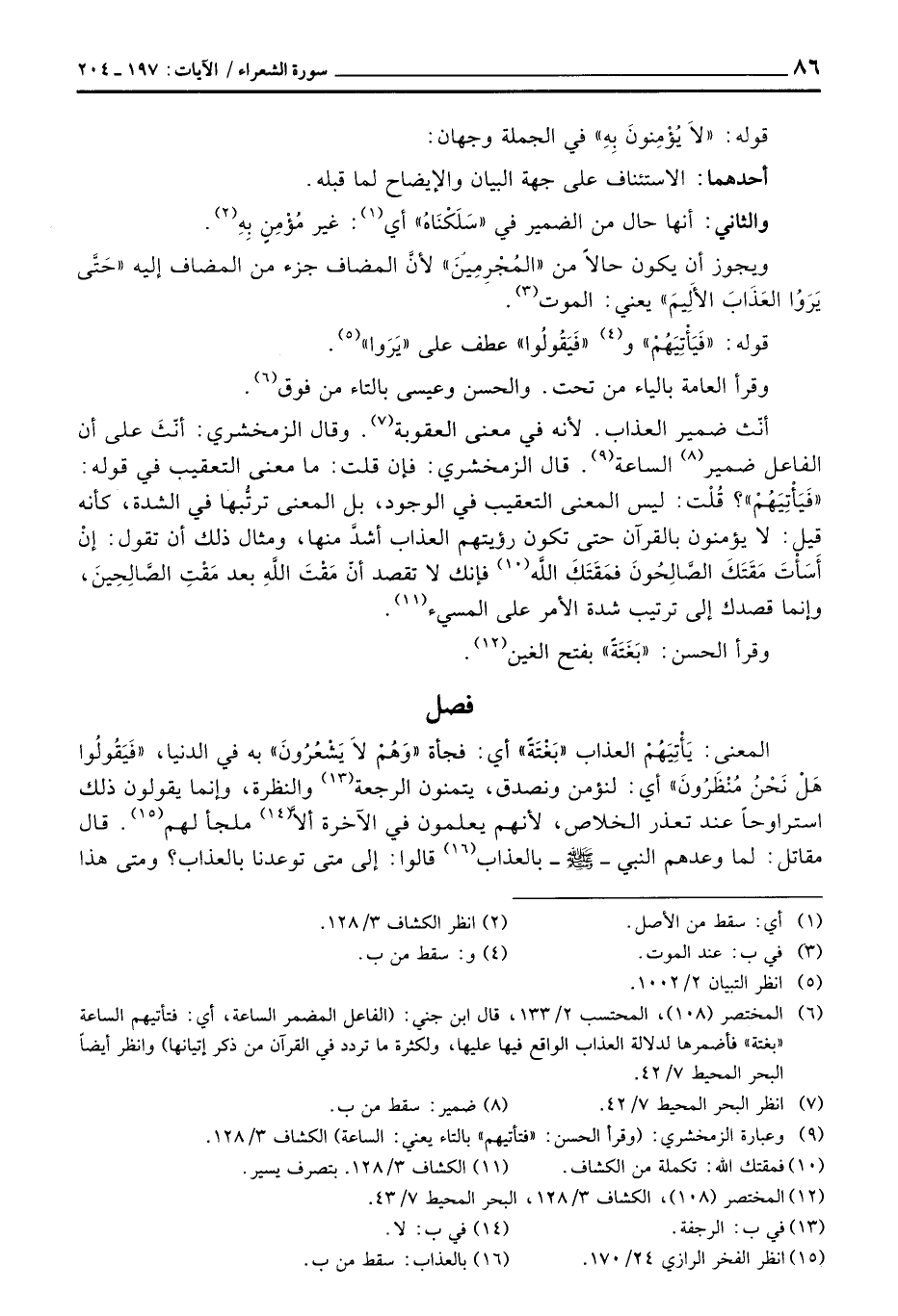 أنّث ضمير العذاب. لأنه في معنى العقوبة. وقال الزمخشري: أنّثَ على أن الفاعل ضمير الساعة. قال الزمخشري: فإن قلت: ما معنى التعقيب في قوله: «فَيَأْتِيَهُمْ» ؟ قُلْت: ليس المعنى التعقيب في الوجود، بل المعنى ترتُّبها في الدشة، كأنه قيل: لا يؤمنون بالقرآن حتى تكون رؤيتهم العذاب أشدَّ منها، ومثال ذلك أن تقول: إنْ أَسَأتَ مَقَتَكَ الصَّالِحُونَ فمَقَتَكَ اللَّه فإنك لا تقصد أنّ مَقْتَ اللَّهِ بعد مَقْتِ الصَّالِحينَ، وإنما قصدك إلى ترتيب شدة المر على المسيء.