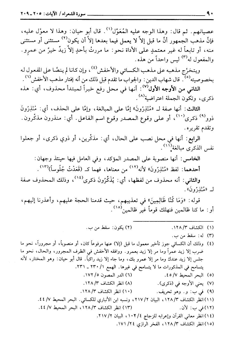 والثاني: أنه محذوف من لفظها، أي: يُذَكِّرُونَ ذكرى، وذلك المحذوف صفة ب «مُنْذِرُوَن» .