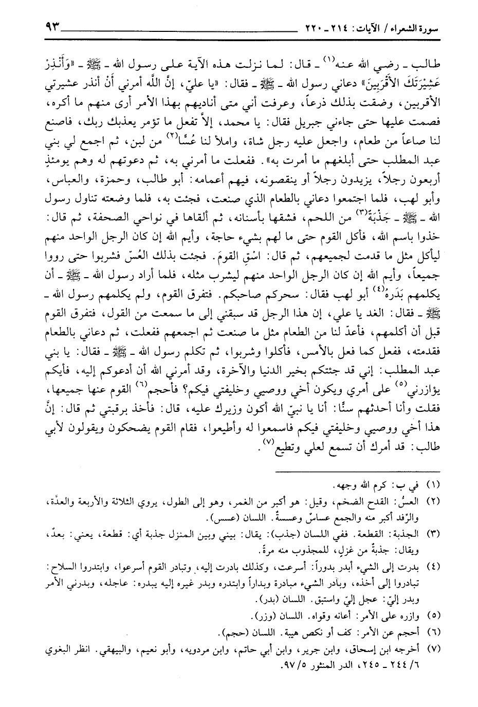 طالب - رَضِيَ اللَّهُ عَنْه - قال: لما نزلت هذه الآية على رسول الله صَلَّى اللَّهُ عَلَيْهِ وَسَلَّم َ - {وَأَنذِرْ عَشِيرَتَكَ الأقربين} دعاني رسول الله - صَلَّى اللَّهُ عَلَيْهِ وَسَلَّم َ - فقال: «يا عليّ، إنَّ اللَّه أمرني أَنْ أنذر عشيرتي الأقربين، وضقت بذلك ذرعاً، وعرفت أني متى أناديهم بهذا الأمر أرى منهم ما أكره، فصمت عليها حتى جاءني جبريل فقال: يا محمد: إلاَّ تفعل ما تؤمر يعذبك ربك، فاصنع لنا صاعاً من طعام، واجعل عليه رجل شاة، واملأ لنا عُسَّا من لبن، ثم اجمع لي بني عبد المطلب عت أبلغهم ما أمرت به» . ففعلت ما أمرني به، ثم دعوتهم له وهم يؤمئذٍ أربعون رجلاً، يزيدون رجلاً او ينقصونه، فيهم أعمامه: أبو طالب، وحمزة، والعباس، وأبو لهب، فلما اجتمعوا دعاني بالطعام الذي صنعت، فجئت به، فلما وضعته تناول رسول الله - صَلَّى اللَّهُ عَلَيْهِ وَسَلَّم َ - جَذْبَةً من اللحم، فشقها بأسنانه، ثم ألقاها في نواحي الحصفة، ثم قال: خذوا باسم الله، فأكل القوم حتى ما لهم بشيء حاجة، وأيم الله إن كان الرجل الواحد منهم ليأكل مثل ما قدمت لجميعهم، ثم قال: اسْقِ القومَ. فجئت بذلك العُسْ فشربوا حتى رووا جميعاً، وأيم الله إن كان الرجل الواحد منهم ليشرب مثله، فلما أراد رسول الله - صَلَّى اللَّهُ عَلَيْهِ وَسَلَّم َ - أن يكلمهم بَدَرهُ أبو لهب فقال: سحركم صاحبكم: فتفرق القوم، ولم يكلمهم رسول الله - صَلَّى اللَّهُ عَلَيْهِ وَسَلَّم َ - فقال: الغد يا علي، إن هذا الرجل قد سبقني إلى ما سمعت من القول، فتفرق القوم قبل أن أكلمهم، فأعدّ لنا من الطعام مثل ما صنعت ثم اجمعهم ففعلت، ثم دعاني بالطعام فقدمته، ففعل كما فعل بالأمس، فأكلوا وشربوا، ثم تكلم رسول الله - صَلَّى اللَّهُ عَلَيْهِ وَسَلَّم َ - فقال: يا نبي عبد المطلب: إني قد جئتكم بخير الدنيا والآخرة، وقد أمرني الله أن أدعوكم إليه، فإيكم يؤازرني على أمري ويكون أخي ووصيي وخليفتي فيكم؟ فأحجم القوم عنها جميعاً، فقلت وأنا أحدثهم سنّاً: أنا يا نبيّ الله أكون وزيرك عيله، قال: فأخذ برقبتي ثم قال: إنَّ هذا أخي ووصيي وخليفتي فيكم فاسمعوا له وأطيعوا، فقام القوم يضحكون ويقولون لأبي طالب. قد أمرك أن تسمع لعلي وتطيع «