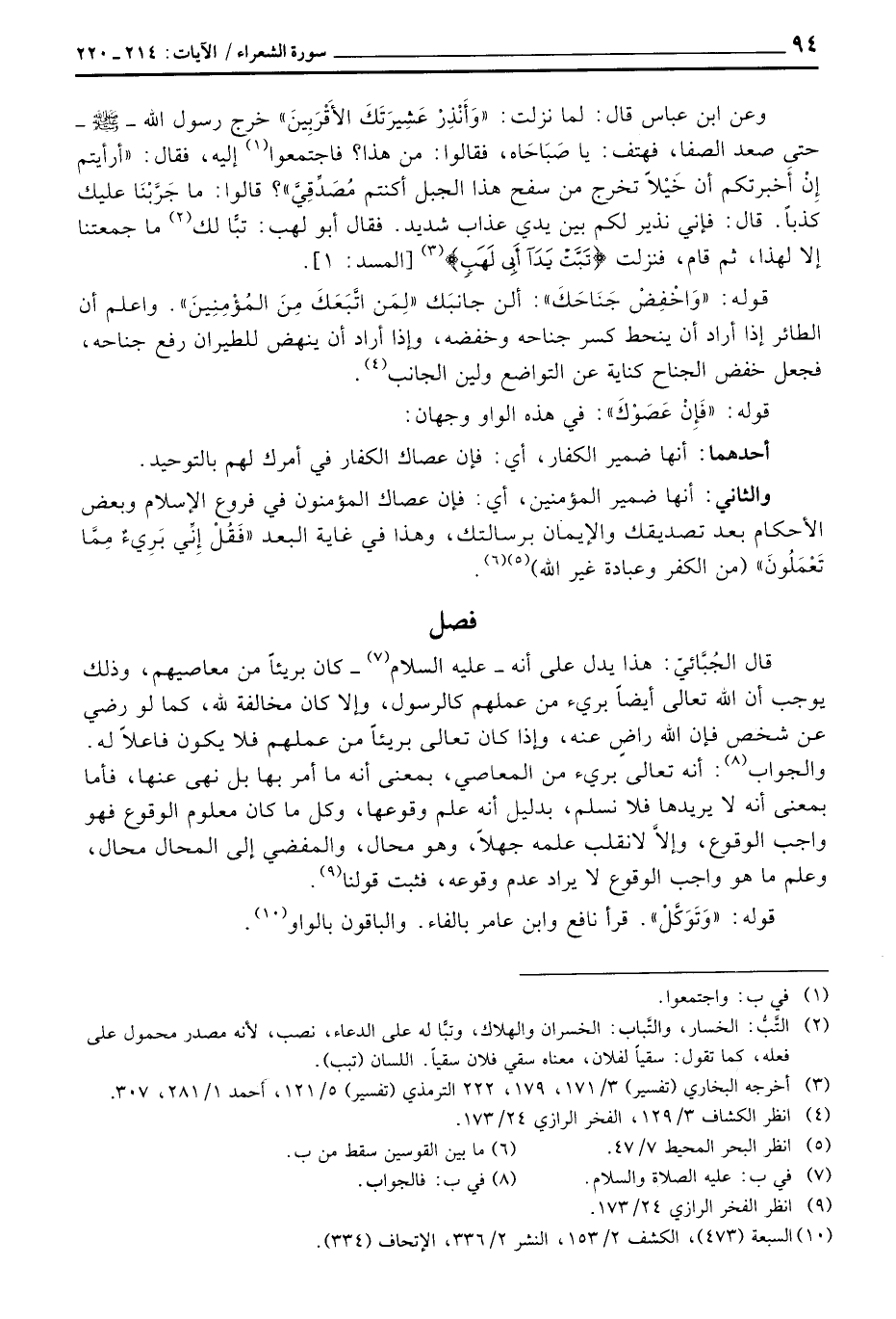 قال الجُبَّائيّ: هذا يدل على أنه - عليه السلام - كان بريئاً من معاصيهم، وذلك يوجب أن الله تعالى أيضاً بريء من عملهم كالرسول، وإلا كان مخالفة لله، كما لو رضي عن شخص فإن الله راضٍ عنه، وإذا كان تعالى بريئاً من عملهم فلا يكون فاعلاً له. والجواب: أنه تعالى بريء من المعاصي، بمعنى أنه ما أمر بها بل نهى عنها، فأما بمعنى أنه لا يريدها فلا نسلم، بدليل انه علم وقوعها، وكل ما كان معلوم الوقوع فهو واجب الوقوع، وإلاَّ لانقلب علمه جهلاً، وهو محال، والمفضي إلى المحال محال، وعلم ما هو واجب الوقوع لا يراد عدم وقوعه، فثبت قولنا.
