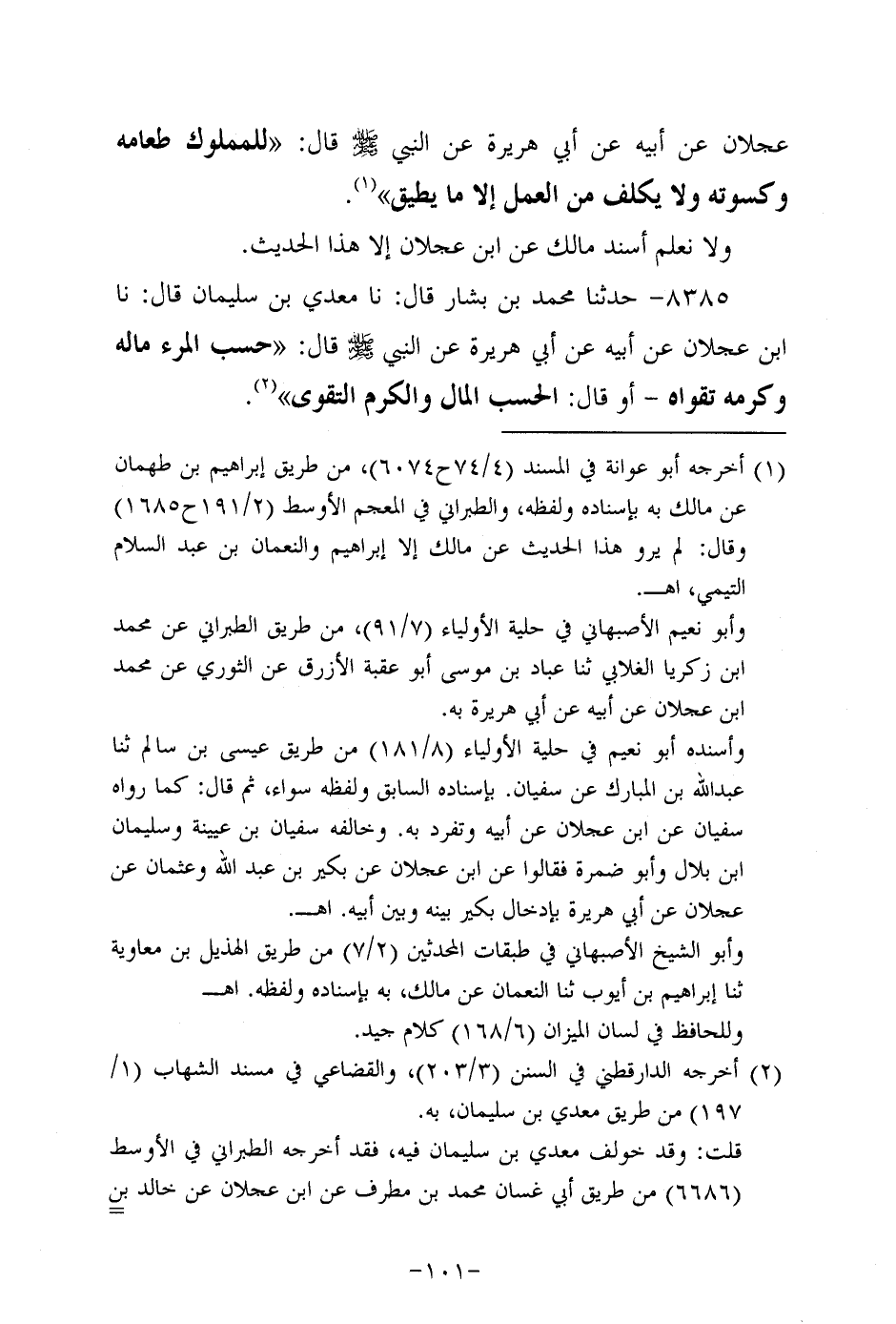 8385- حَدَّثنا مُحَمد بن بَشَّار، قَال: حَدَّثنا معدي بن سُلَيْمان، قَال: حَدَّثنا ابن عَجْلان، عَن أَبِيه، عَن أَبِي هُرَيرة، عَن النَّبِيّ صَلَّى الله عَلَيه وَسَلَّم قال: حسب المرء ماله وكرمه تقواه، أو قال: الحسب المال والكرم التقوي.