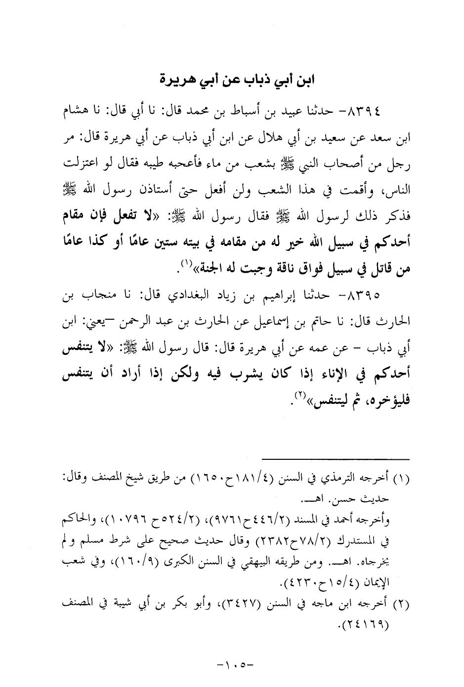 8394- حَدَّثنا عُبَيد بن أسباط بن مُحَمد، قَال: حَدَّثنا أبي، قَال: حَدَّثنا هشام بن سَعْد، عَن سَعِيد بن أبي هلال، عَن ابن أبي ذباب، عَن أبي هُرَيرة، قال: مر رَجُلٌ مِنْ أَصْحَابِ النَّبِيّ صَلَّى اللَّهُ عَلَيه وَسَلَّم بشعب من ماء فأعجبه طيبه فقال لو اعتزلت الناس وأقمت في هذا الشعب ولن أفعل حتى أستأذن رَسُولِ اللَّهِ صَلَّى اللَّهُ عَلَيه وَسَلَّم فَذَكَرَ ذَلِكَ لِرَسُولِ اللَّهِ صَلَّى اللَّهُ عَلَيه وَسَلَّم فَقَالَ رَسُولُ اللَّهِ صَلَّى اللَّهُ عَلَيه وَسَلَّم: لا تفعل فإن مقام أحدكم في سبيل الله خير له من مقامه في بيته ستين عاما، أو كذا عاما من قاتل في سبيل فواق نافة وجبت له الجنة.