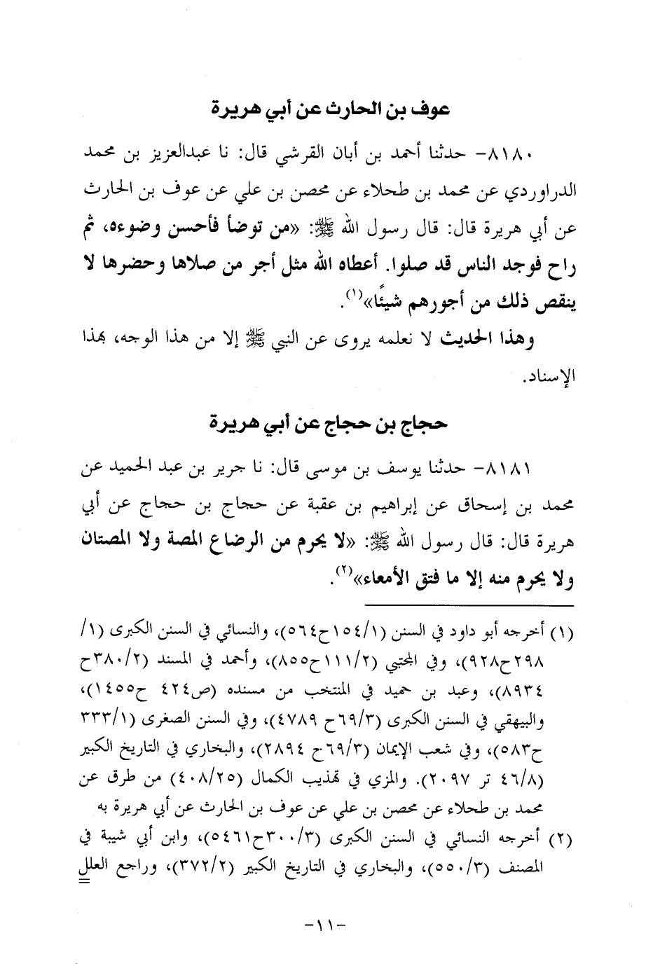 8180- حَدَّثنا أحمد بن أَبَان القرشي، قَال: حَدَّثنا عَبد العزيز بن مُحَمد الدَّرَاوَرْدِيّ عن مُحَمد بن طحلاء عن محصن بن علي عن عوف بن الحارث، عَن أبي هُرَيرة، قَالَ: قَالَ رَسُول اللهِ صَلَّى اللَّهُ عَلَيه وَسَلَّم: من توضأ فأحسن وضوءه، ثُمَّ راح فوجد الناس قد صلوا أعطاه الله مثل أجر من صلاها وحضرها لا ينقص ذلك من أجورهم شَيْئًا.