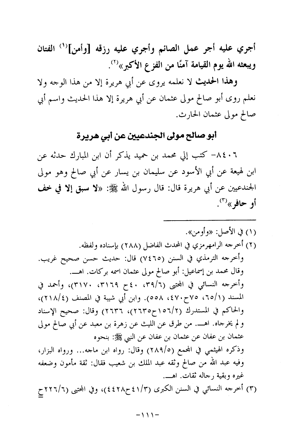 8406- كتب إلي مُحَمد بن حُمَيد يذكر أن ابن المبارك حدثه، عَن ابن لهيعة، عَن أبي الأسود بن يسار، عَن أبي صالح، وهُو مولى الجندعيين، عَن أبي هُرَيرة، قَالَ: قَالَ رَسُول اللهِ صَلَّى اللَّهُ عَلَيه وَسَلَّم: لا سبق إلاَّ في خف، أو حافر.