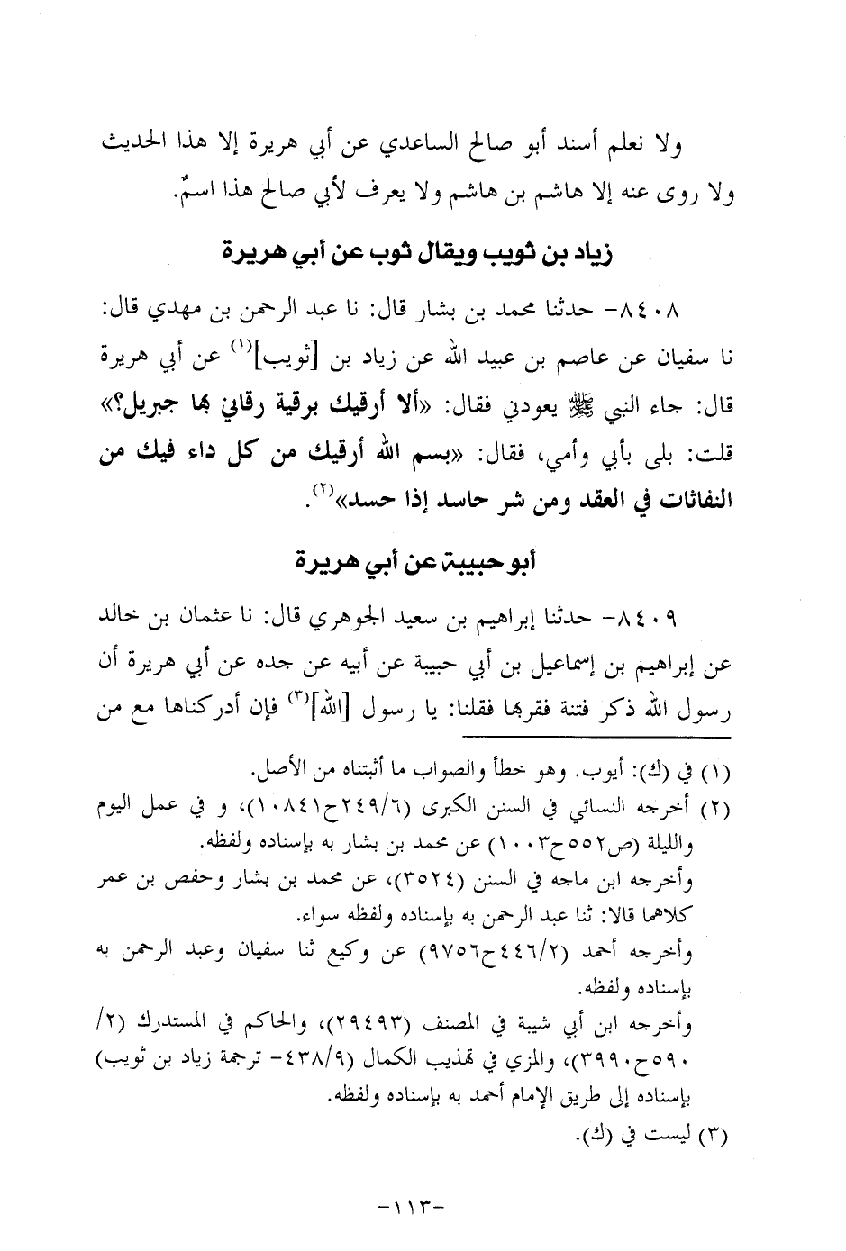 8408- حَدَّثنا مُحَمد بْنُ بَشَّار، قَال: حَدَّثنا عَبد الرحمن بن مهدي، قَال: حَدَّثنا سُفيان، عَن عَاصِم بْنِ عُبَيد اللَّهِ، عَن زياد بن ثُوَيب، عَن أبي هُرَيرة، قال: جاء النَّبِيّ صَلَّى الله عَلَيه وَسَلَّم يعودني فقال: ألا أرقيك برقية رقاني بها جبريل؟ قلت: بلى بأبي وأمي فقال: بسم الله أرقيك، من كل داء فيك، من النفاثات في العقد، وَمَنْ شر حاسد إذا حسد.