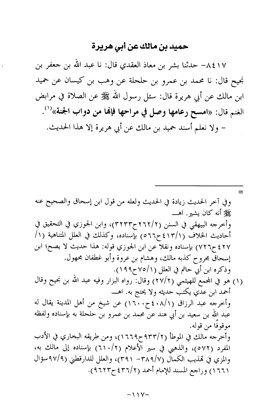 8417- حَدَّثنا بِشْر بن معاذ العقدي، قَال: حَدَّثنا عَبد الله بن جعفر بن نجيح، قَال: حَدَّثنا مُحَمد بن عَمْرو بن حلحلة عن وهب بن كَيْسان عن حُمَيد بن مالك، عَن أبي هُرَيرة، قَالَ: سُئِلَ رَسُولُ اللَّهِ صَلَّى اللَّهُ عَلَيه وَسَلَّم عن الصلاة في مرابض الغنم قال: امسح رعامها وصل في مراحها فإنها من دواب الجنة.