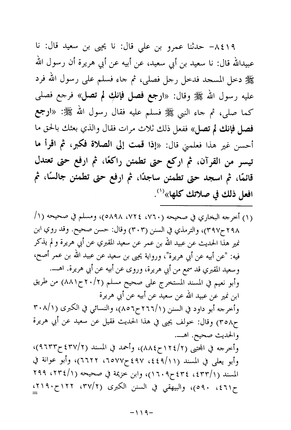 8419- حَدَّثَنا عَمْرُو بْنُ عَلِيٍّ، قَال: حَدَّثنا يحيى بن سَعِيد قال: حدثنا عُبَيد الله، قَال: حَدَّثنا سَعِيد بن أبي سَعِيد، عَن أَبِيه، عَن أبي هُرَيرة؛ أَنَّ رَسُولَ اللهِ صَلَّى اللَّهُ عَلَيه وَسَلَّم دخل المسجد فدخل رجل فصلى، ثُمَّ جاء فسلم على رسول الله فَرَدَّ عَلَيْهِ رَسُولُ اللَّهِ صَلَّى اللَّهُ عَلَيه وَسَلَّم، وَقال: ارجع فصل فإنك لم تصل فرجع فصلى كما صلى، ثُمَّ جاء النَّبِيّ صَلَّى الله عَلَيه وَسَلَّم فسلم عَلَيْهِ فَقَالَ رَسُولُ اللَّهِ صَلَّى اللَّهُ عَلَيه وَسَلَّم: ارجع فصل فإنك لم تصل ففعل ذلك ثلاث مرات فقال والذي بعثك بالحق ما أحسن غير هذا فعلمني قال: إذا قمت إلى الصلاة فكبر، ثُمَّ اقرأ ما تيسر من القرآن، ثُمَّ اركع حتى تطمئن راكعا، ثُمَّ ارفع حتى تعتدل قائما، ثُمَّ اسجد حتى تطمئن ساجدا، ثُمَّ ارفع حتى تطمئن جالسا، ثُمَّ افعل ذلك في صلاتك كلها.