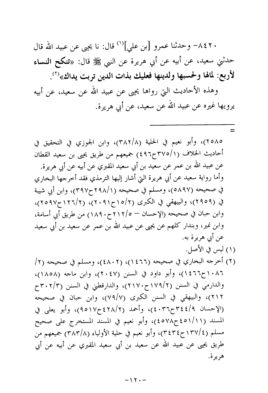 8420- وحَدَّثَنا عَمْرُو بْنُ عَلِيٍّ، قَال: حَدَّثنا يحيى عن عُبَيد الله، قَال: حَدَّثني سَعِيد، عَن أَبِيه، عَن أَبِي هُرَيرة، عَن النَّبِيّ صَلَّى الله عَلَيه وَسَلَّم قال: تنكح النساء لأربع لمالها ولحسبها ولدينها فعليك بذات الدين تربت يداك (1) .