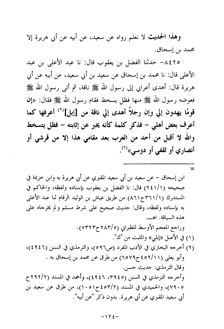 8425- حَدَّثنا الفضل بن يعقوب، قَال: حَدَّثنا عَبد الأعلى بن عَبد الأعلى، قَال: حَدَّثنا مُحَمد بن إسحاق، عَن سَعِيد بن أبي سَعِيد، عَن أَبِيه، عَن أبي هُرَيرة، قال: أهدى أعرابي إلى رسول الله صلى الله عليه ناقة، ثُمَّ أَتَى رَسُولَ اللَّهِ صَلَّى اللَّهُ عَلَيه وَسَلَّم فعوضه رَسُولِ اللَّهِ صَلَّى اللَّهُ عَلَيه وَسَلَّم مِنْهَا فظل يسخط فَقَامَ رَسُولُ اللَّهِ صَلَّى اللَّهُ عَلَيه وَسَلَّم فقال: إن قوما يهدون إِلَيَّ، وَإن رجلاً أهدى إلي ناقة من إبل أعرفها كما أعرف بعض أهلي -فذكر كلمة كأنه يخبر عن إثابته- فظل يتسخط والله لا أقبل من أحد من العرب بعد مقامي هذا إلاَّ مِنْ قُرَشِيٍّ، أَوْ أَنْصَارِيٍّ، أَوْ ثَقَفِيٍّ، أو دوسي.