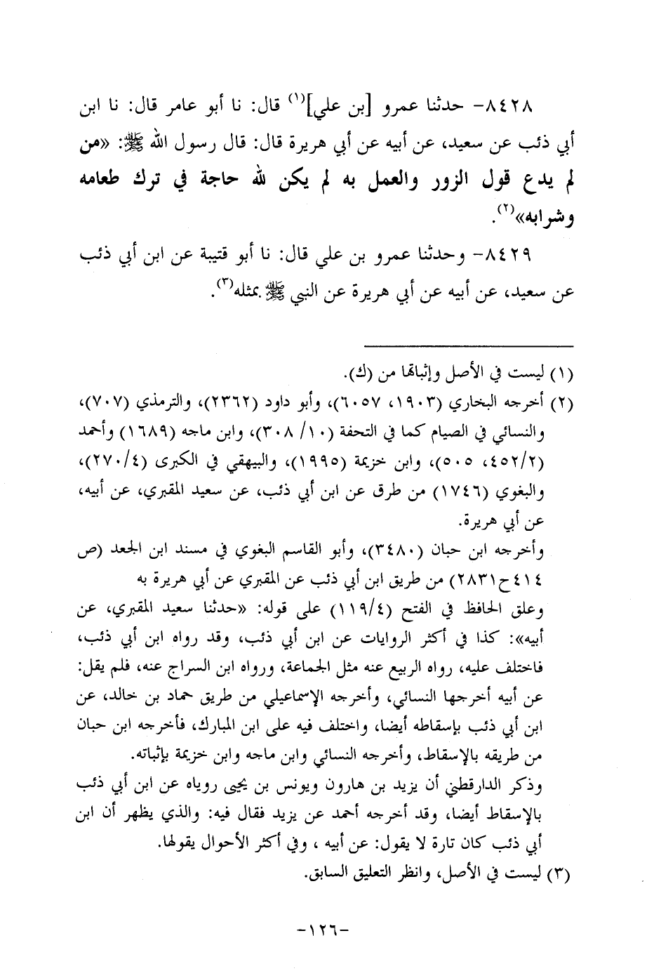 8428- حَدَّثَنا عَمْرُو بْنُ عَلِيٍّ، قَال: حَدَّثنا أَبُو عامر، قَال: حَدَّثنا ابن أبي ذِئب، عَن سَعِيد، عَن أَبِيه، عَن أبي هُرَيرة، قَالَ: قَالَ رَسُول اللهِ صَلَّى اللَّهُ عَلَيه وَسَلَّم: من لم يدع قول الزور والعمل به لم يكن لله حاجة في ترك طعامه وشرابه.