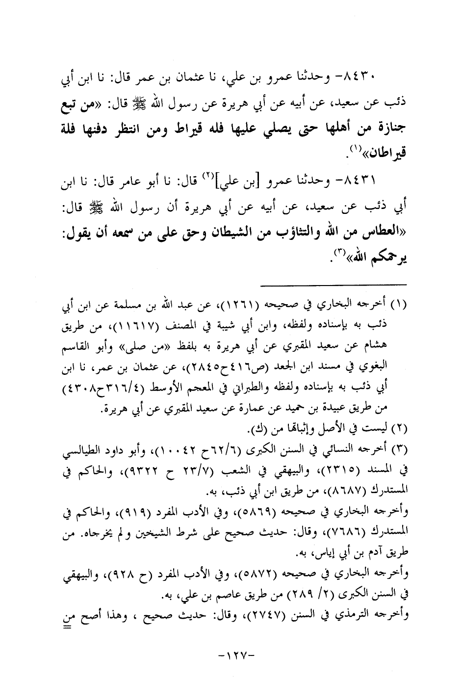 8431- وحَدَّثَنا عَمْرُو بْنُ عَلِيٍّ، قَال: حَدَّثنا أَبُو عامر، قَال: حَدَّثنا ابن أبي ذِئب، عَن سَعِيد، عَن أَبِيه، عَن أبي هُرَيرة؛ أَنَّ رَسُولَ اللهِ صَلَّى اللَّهُ عَلَيه وَسَلَّم قال: العطاس من الله والتثاؤب من الشيطان وحق على من سمعه أَن يقول: يرحمكم الله.