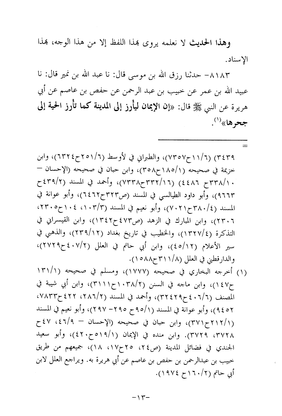 8183- حَدَّثنا رزق الله بن موسى، قَال: حَدَّثنا عَبد الله بن نُمَير، قَال: حَدَّثنا عُبَيد الله بن عُمَر عَنْ خُبَيْبِ بْنِ عَبْدِ الرَّحْمَنِ، عَن حَفْصِ بن عَاصِم، عَن أَبِي هُرَيرة، عَن النَّبِيّ صَلَّى اللَّهُ عَلَيه وَسَلَّم قال: إِنَّ الإِيمَانَ لَيَأْرِزُ إِلَى الْمَدِينَةِ كَمَا تَأْرِزُ الحية إلى جحرها.