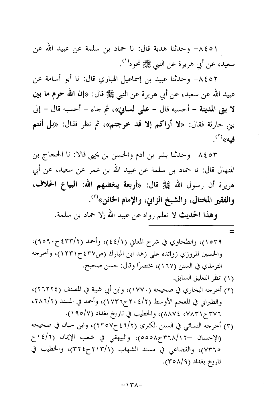 8453- وحَدَّثنا بِشْر بن آدم، وَالحَسن بن يحيى، قَالاَ: حَدَّثنَا الحجاج بن المنهال، قال، حَدَّثنا حماد بن سَلَمَةَ عَنْ عُبَيد اللَّهِ بْنِ عُمَر، عَن سَعِيد، عَن أبي هُرَيرة؛ أَنَّ رَسُولَ اللهِ صَلَّى اللَّهُ عَلَيه وَسَلَّم قال: أربعة يبغضهم الله: البياع الحلاف والفقير المختال والشيخ الزاني والإمام الخائن.