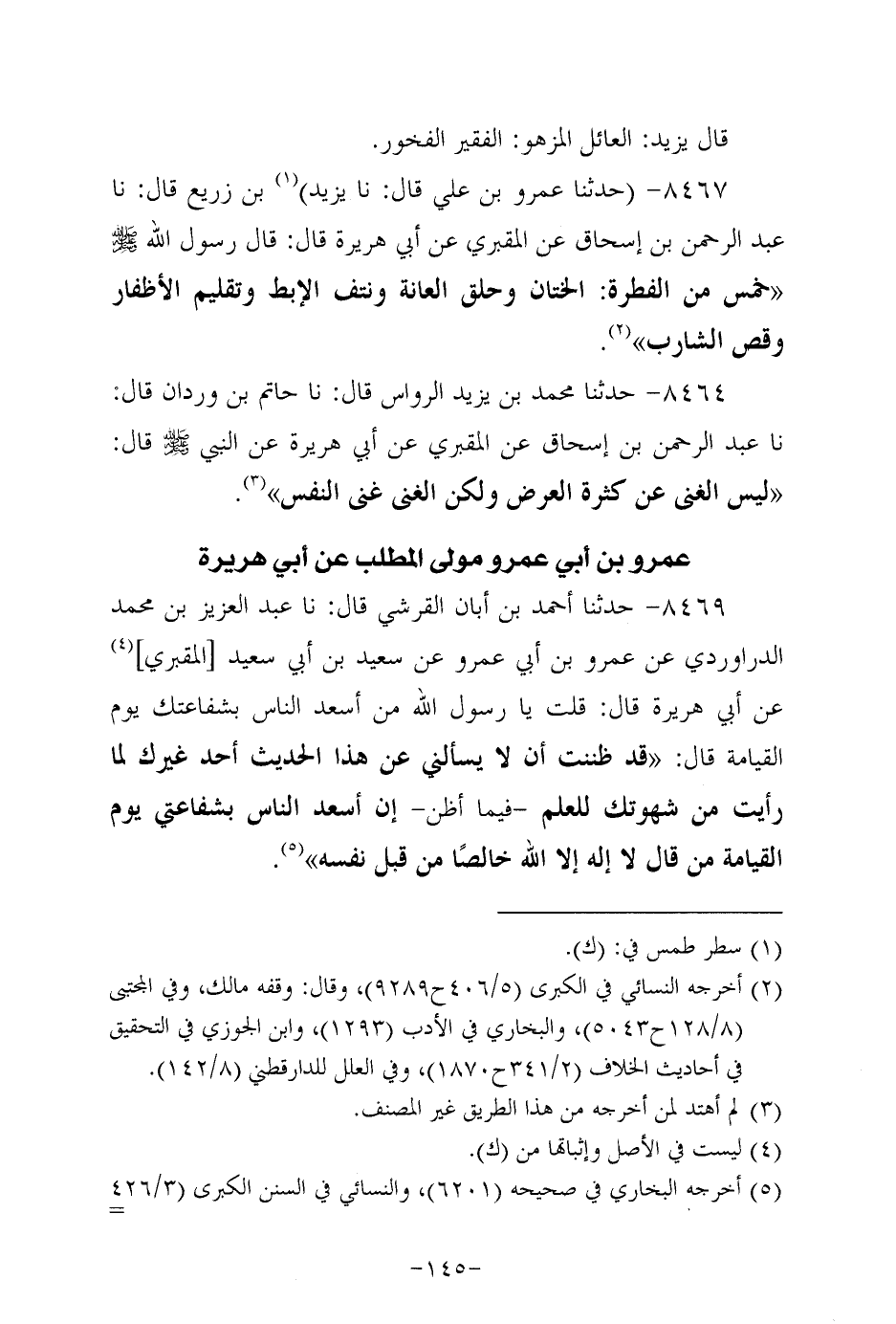 8467- حَدَّثَنا عَمْرُو بْنُ عَلِيٍّ، قَال: حَدَّثنا يزيد بن زريع، قَال: حَدَّثنا عَبد الرحمن بن إسحاق، عَن الْمَقْبُرِيّ، عَن أبي هُرَيرة، قَالَ: قَالَ رَسُول اللهِ صَلَّى اللَّهُ عَلَيه وَسَلَّم: خمس من الفطرة: الختان وحلق العانة ونتف الإبط وتقليم الأظفار وقص الشارب.
