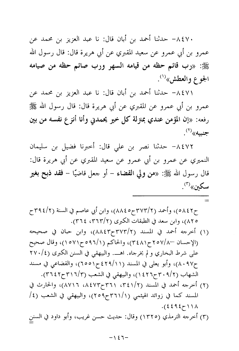 8472- حَدَّثنا نصر بن علي، قال: أَخْبَرنا فضيل بن سُلَيْمان النميري عن عَمْرو بن أبي عَمْرو، عَن سَعِيد الْمَقْبُرِيّ، عَن أبي هُرَيرة، قَالَ: قَالَ رَسُول اللهِ صَلَّى اللَّهُ عَلَيه وَسَلَّم: من ولي القضاء، أو جعل قاضيا - فقد ذبح بغير سكين.