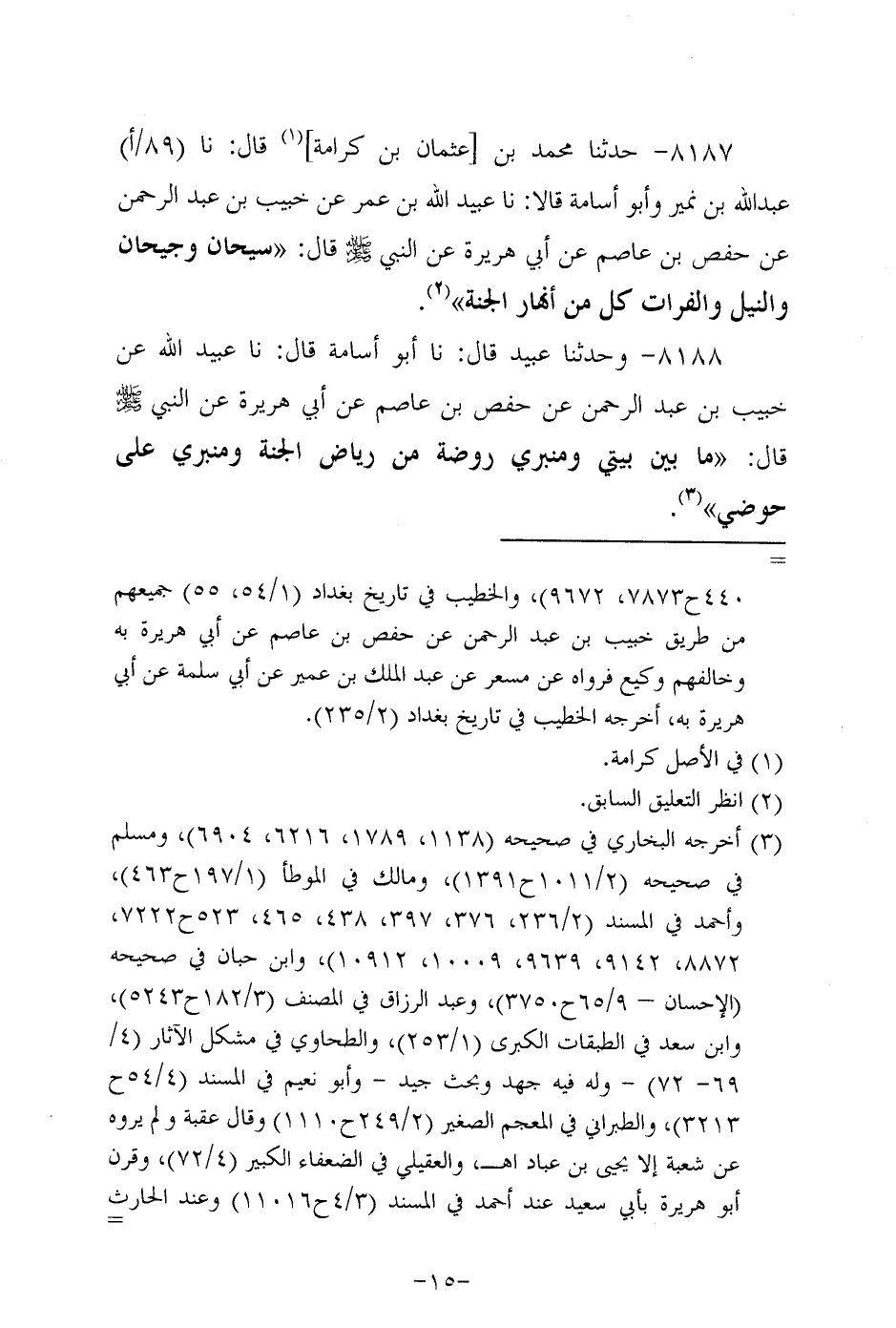 8187- حَدَّثنا مُحَمد بْنُ عُثْمَانَ بْنِ كَرَامَةَ، قَال: حَدَّثنا عَبد الله بن نُمَير، وَأبُو أسامة، قَالاَ: حَدَّثنَا عُبَيد الله بن عُمَر عَنْ خُبَيْبِ بْنِ عَبْدِ الرَّحْمَنِ، عَن حَفْصِ بن عَاصِم، عَن أَبِي هُرَيرة، عَن النَّبِيّ صَلَّى اللَّهُ عَلَيه وَسَلَّم قال: سيحان وجيحان والنيل والفرات كل من أنهار الجنة.