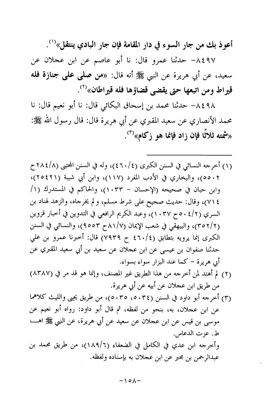 8497- حَدَّثنا عَمْرو، قَال: حَدَّثنا أَبُو عَاصِم، عَن ابن عَجْلان، عَن سَعِيد، عَن أَبِي هُرَيرة، عَن النَّبِيّ صَلَّى اللَّهُ عَلَيه وَسَلَّم؛ أَنَّه قَالَ: مَنْ صَلَّى عَلَى جَنَازَةٍ فَلَهُ قِيرَاطٌ، وَمَنْ اتبعها حتى يقضى قضاؤها فله قيراطان.