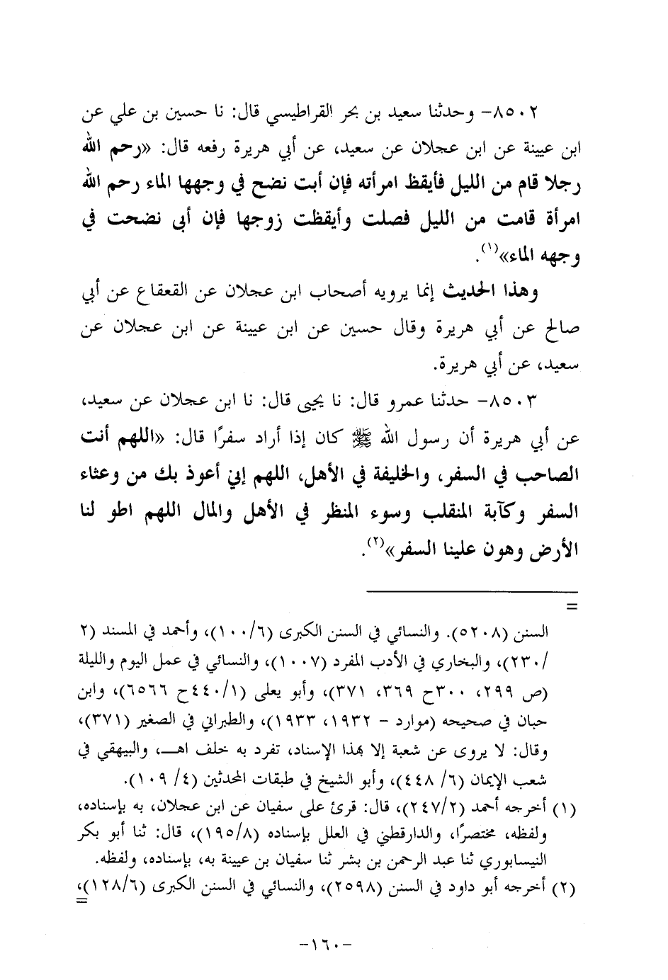 8502- وحَدَّثنا سَعِيد بن بحر القراطيسي، قَال: حَدَّثنا حسين بن علي، عَن ابن عُيَينة، عَن ابن عَجْلان، عَن سَعِيد، عَن أبي هُرَيرة رفعه قال: رحم الله رجلاً قام من الليل فأيقظ امرأته فإن أبت نضح في وجهها الماء رحم الله امرأة قامت من الليل فصلت وأيظت زوجها فإن أبى نضحت في وجهه الماء.