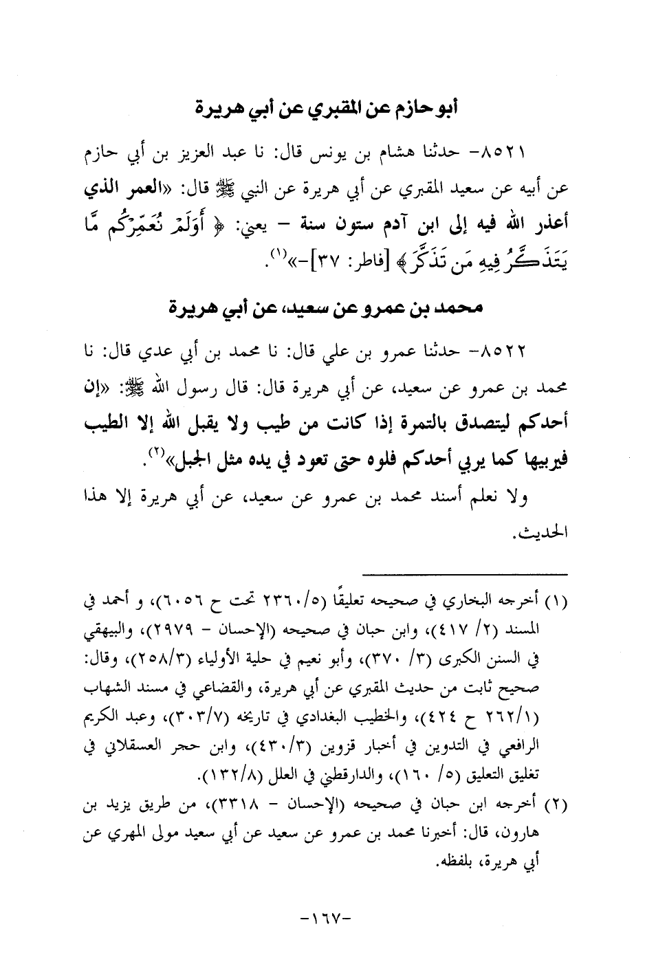 8522- حَدَّثَنا عَمْرُو بْنُ عَلِيٍّ، قَال: حَدَّثنا مُحَمد بن أبي عَدِيّ، قَال: حَدَّثنا مُحَمد بن عَمْرو، عَن سَعِيد، عَن أبي هُرَيرة، قَالَ: قَالَ رَسُول اللهِ صَلَّى اللَّهُ عَلَيه وَسَلَّم: إن أحدكم ليتصدق بالتمرة إذا كانت من طيب، ولاَ يقبل الله إلاَّ الطيب فيربيها كما يربي أحدكم فلوه حتى تعود في يده مثل الجبل.