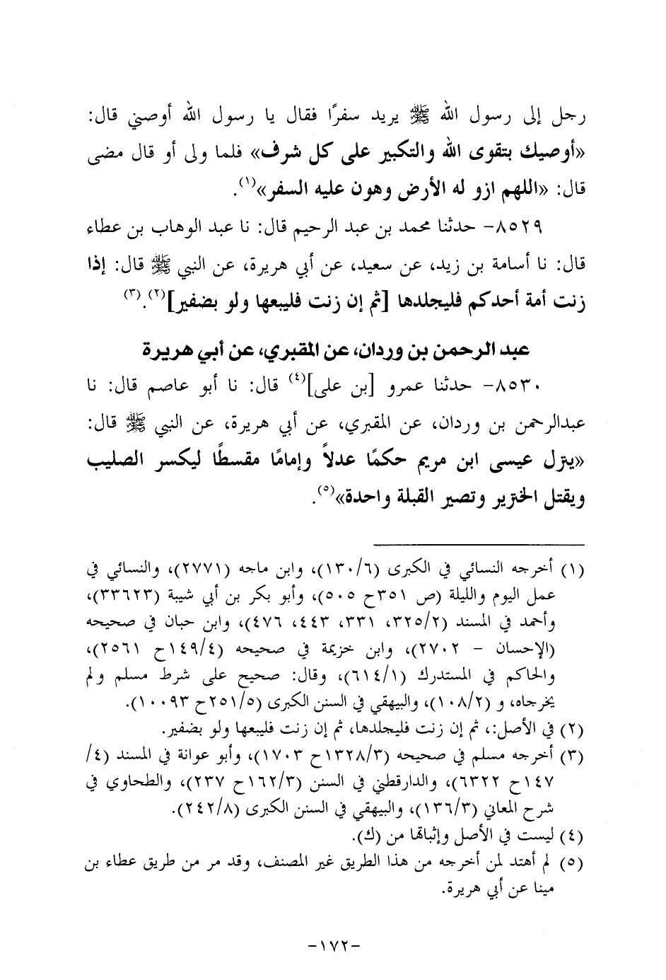 8530- حَدَّثَنا عَمْرُو بْنُ عَلِيٍّ، قَال: حَدَّثنا أَبُو عَاصِم، قَال: حَدَّثنا عَبد الرحمن بن وردان عن الْمَقْبُرِيّ، عَن أَبِي هُرَيرة، عَن النَّبِيّ صَلَّى الله عَلَيه وَسَلَّم قال: ينزل عيسى بن مريم حكما عدلا وإماما مقسطا ليكسر الصليب ويقتل الخنزير وتصير القبلة واحدة.
