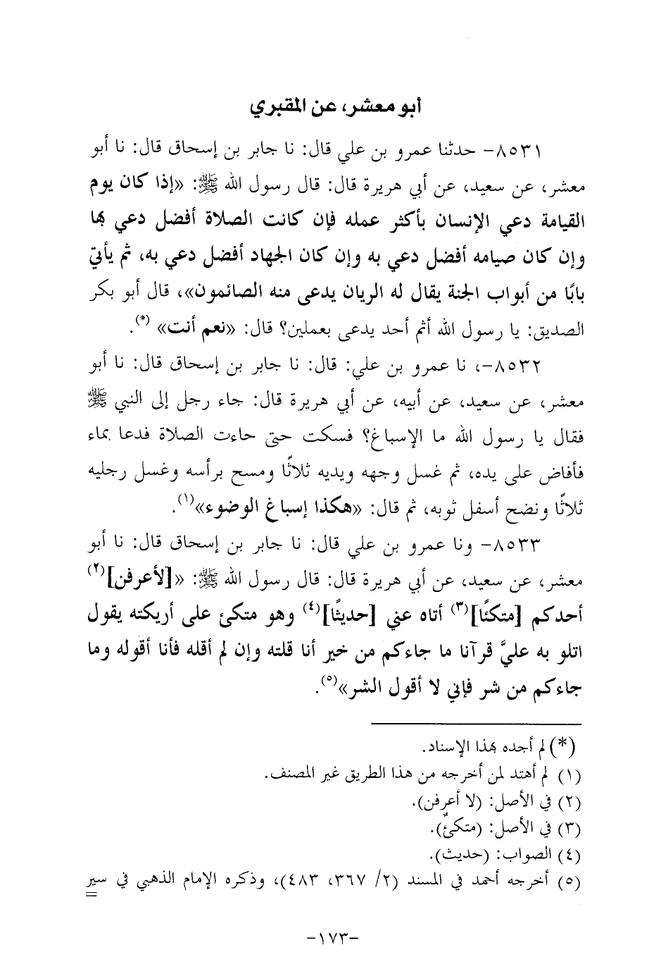 8531- حَدَّثَنا عَمْرُو بْنُ عَلِيٍّ، قَال: حَدَّثنا جابر بن إسحاق، قَال: حَدَّثنا أَبُو معشر، عَن سَعِيد، عَن أبي هُرَيرة، قَالَ: قَالَ رَسُول اللهِ صَلَّى اللَّهُ عَلَيه وَسَلَّم: إذا كان يوم القيامة دعي الإنسان بأكثر عمله فإن كانت الصلاة أفضل دعي بها، وَإن كان صيامه أفضل دعي به، وَإن كان الجهاد أفضل دعي به، ثُمَّ يأتي بابا من أبواب الجنة يقال له الريان يدعى منه الصائمون قال أَبْو بَكْر الصديق: يا رَسولَ اللهِ أثم أحد يدعى بعملين؟ قال: نعم أنت.