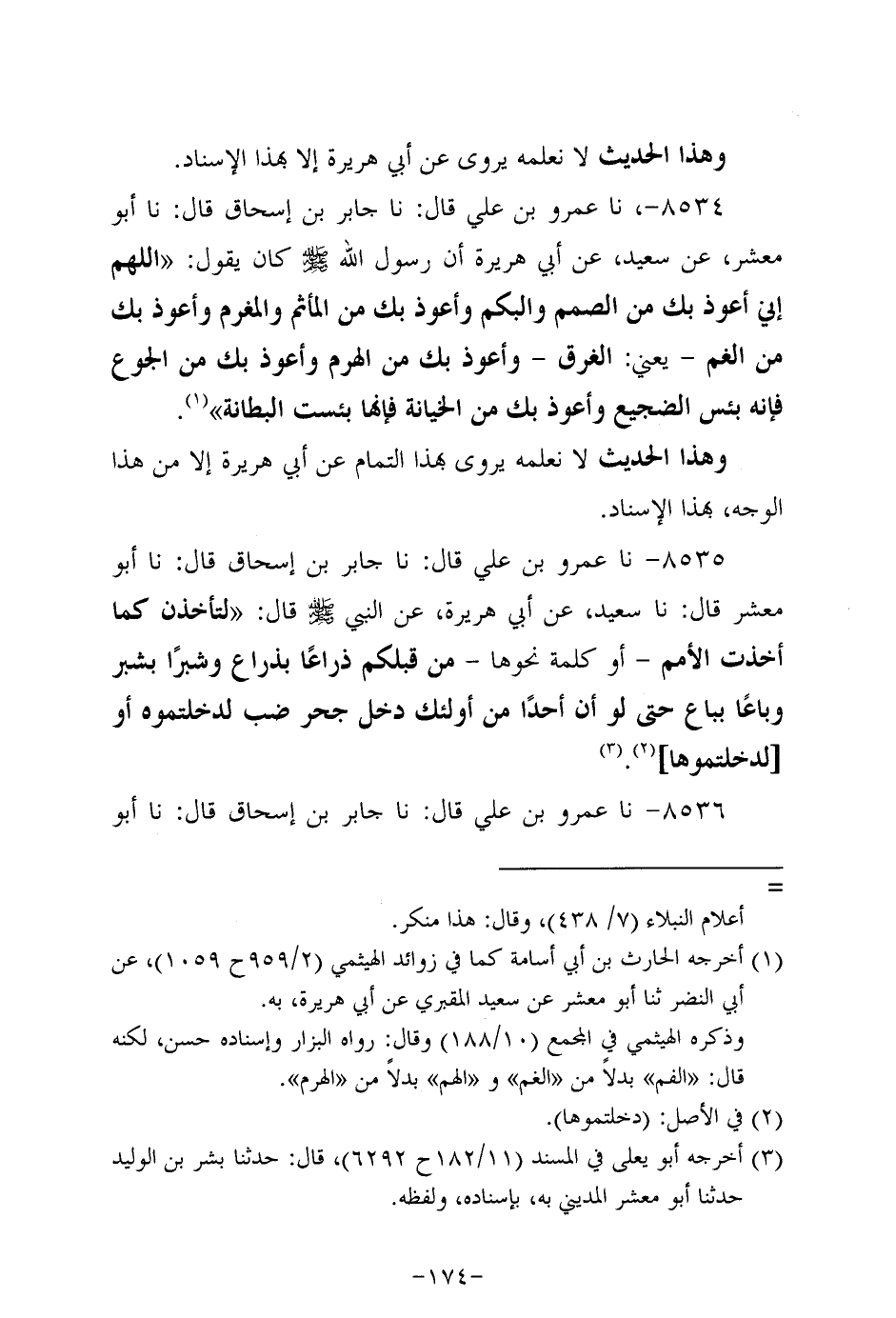 8535- حَدَّثَنا عَمْرُو بْنُ عَلِيٍّ، قَال: حَدَّثنا جابر بن إسحاق، قَال: حَدَّثنا أَبُو معشر، قَال: حَدَّثنا سَعِيد، عَن أَبِي هُرَيرة، عَن النَّبِيّ صَلَّى اللَّهُ عَلَيه وَسَلَّم قال: لتأخذن كما أخذت الأمم، أو كلمة نحوها - من قبلكم ذراعا بذراع وشبرا بشبر وباعا بباع حتى لو أن أَحَدًا من أولئك دخل جحر ضب لدخلتموه، أو لدخلتموها.