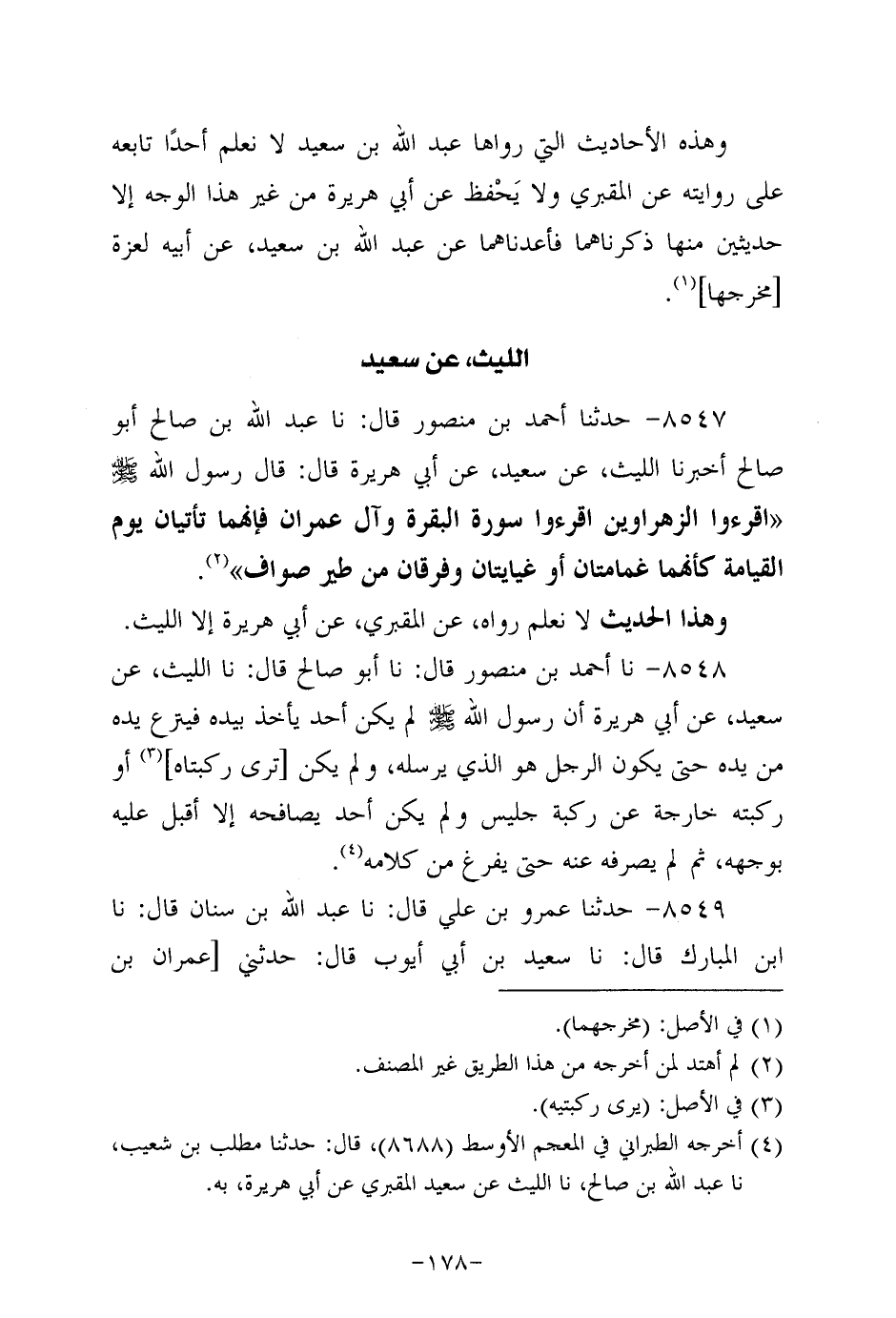 8547- حَدَّثنا أَحمد بن منصور، قَال: حَدَّثنا عَبد الله بن صالح أَبُو صالح أخبرنا اللَّيْث، عَن سَعِيد، عَن أبي هُرَيرة، قَالَ: قَالَ رَسُول اللهِ صَلَّى اللَّهُ عَلَيه وَسَلَّم: اقرؤُوا الزهراوين اقرؤُوا سورة البقرة وآل عمران فإنهما تأتيان يوم القيامة كأنهما غمامتان، أو غيايتان وفرقان من طير صواف.