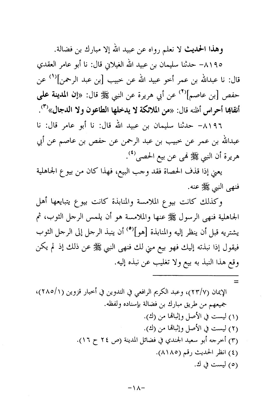 8195- حَدَّثنا سُلَيْمان بن عُبَيد الله الغيلاني، قَال: حَدَّثنا أَبُو عامر العقدي، قَال: حَدَّثنا عَبد الله بن عُمَر أخو عُبَيد الله، عَن خُبَيْبِ بْنِ عَبد الرَّحمَن، عَن حَفْصِ بن عَاصِم، عَن أَبِي هُرَيرة، عَن النَّبِيّ صَلَّى اللَّهُ عَلَيه وَسَلَّم قال: إن المدينة على أنقابها أحراس - أظنه قال - من الملائكة لا يدخلها الطاعون، ولاَ الدجال.