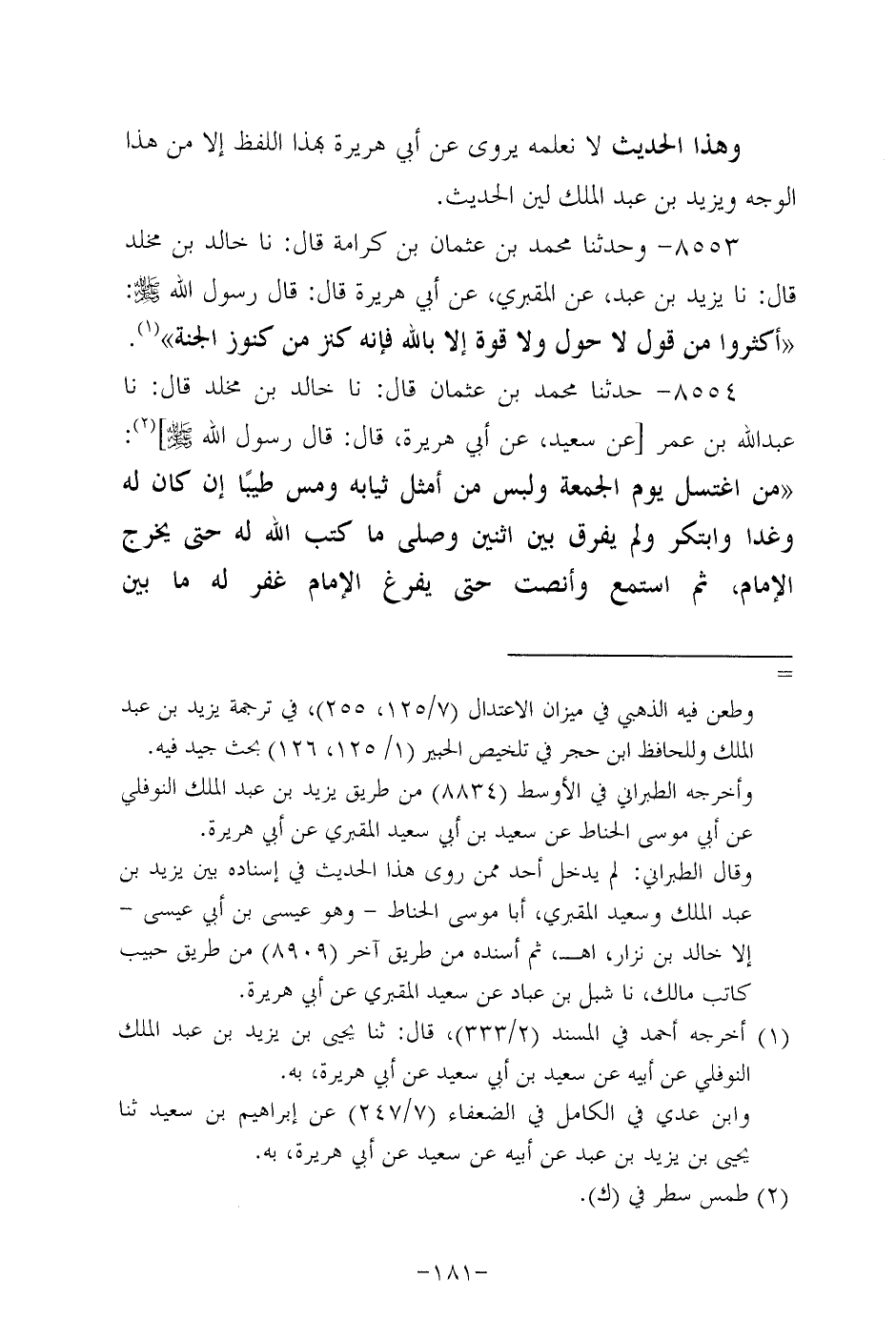 8553- وحَدَّثنا مُحَمد بْنُ عُثْمَانَ بْنِ كَرَامَةَ، قَال: حَدَّثنا خالد بنت مخلد، قَال: حَدَّثنا يزيد بن عَبد عن الْمَقْبُرِيّ، عَن أبي هُرَيرة، قَالَ: قَالَ رَسُول اللهِ صَلَّى اللَّهُ عَلَيه وَسَلَّم: أكثروا من قول لا حول، ولاَ قوة إلاَّ بالله فإنه كنز من كنوز الجنة.